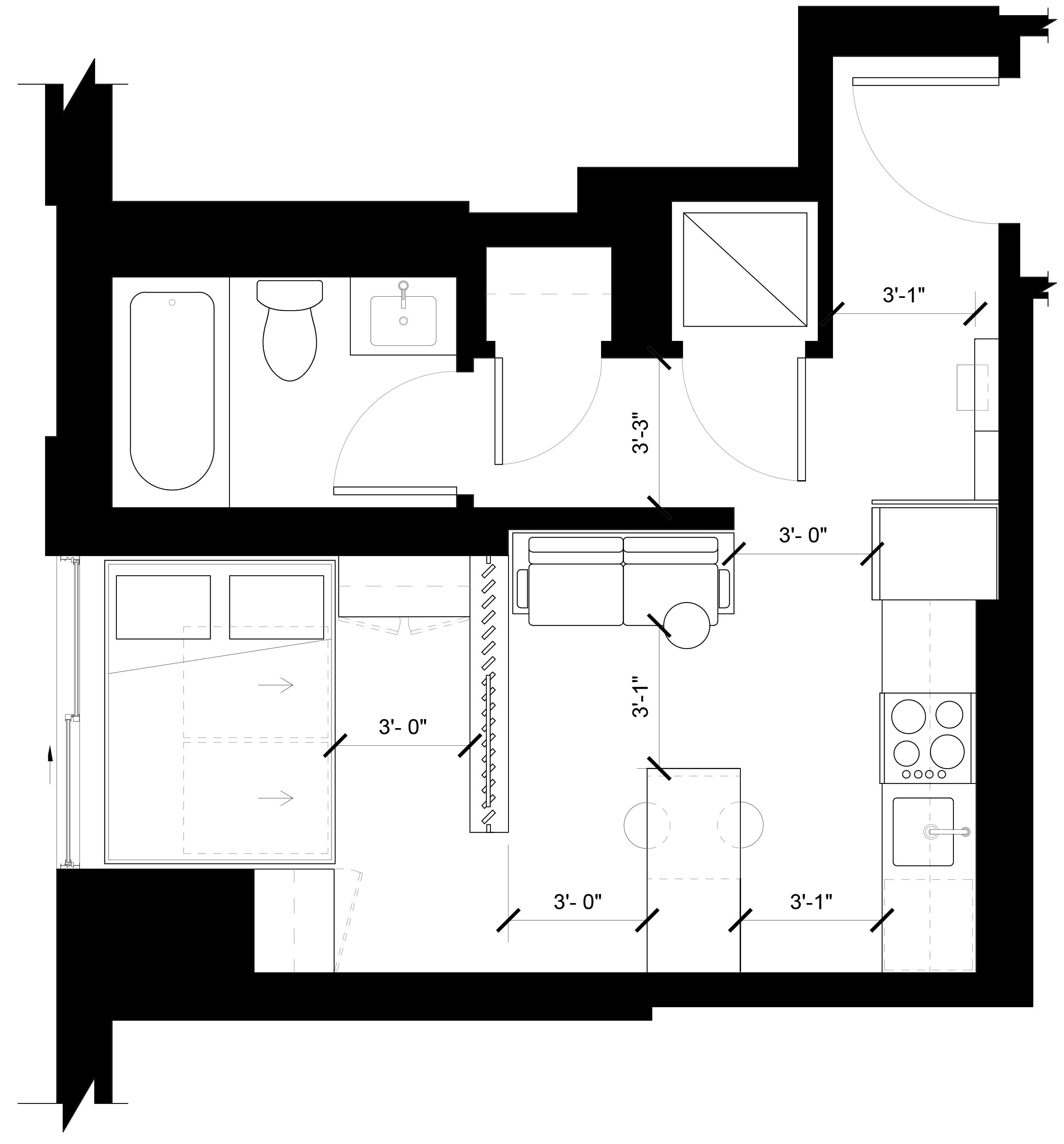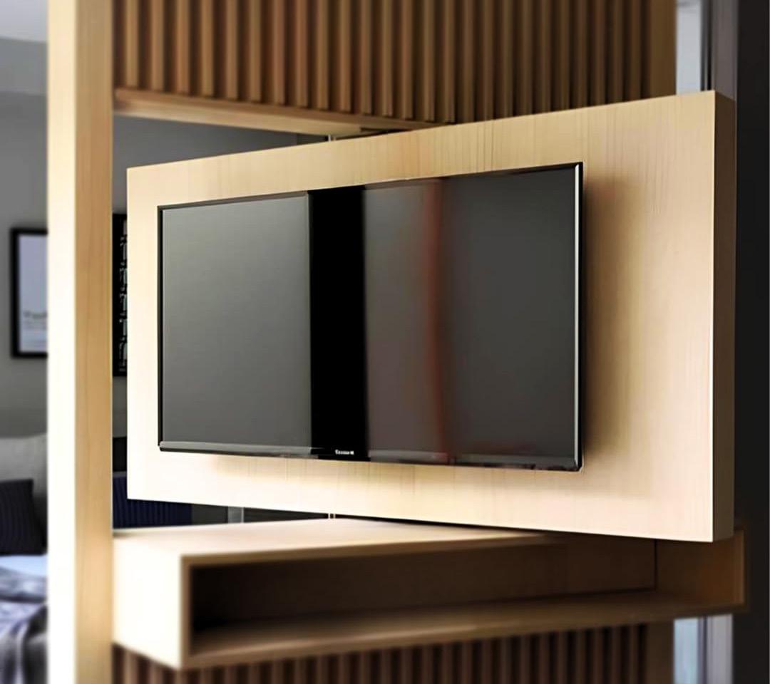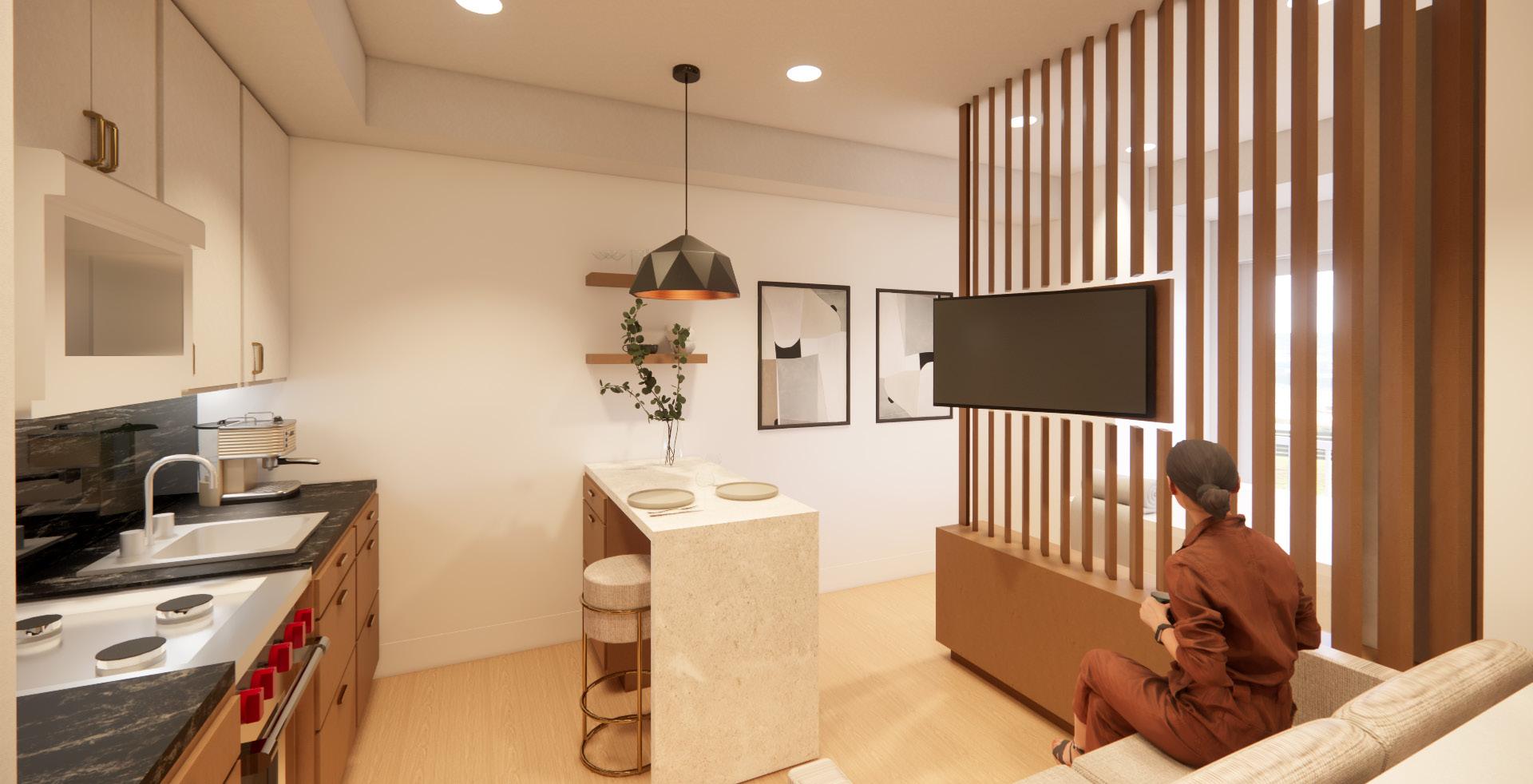 The living area and sleeping alcove is separated by a custom panel partition that features a rotating TV, shelving and storage. These panels rotate allowing the tenant to control the amount of light within the living space. Additionally, closing these panels creates a sense of privacy, as it blocks direct sight lines into the sleeping alcove. The TV rotates 180 degrees, creating the flexibility to angle the TV towards the living area or sleeping alcove.