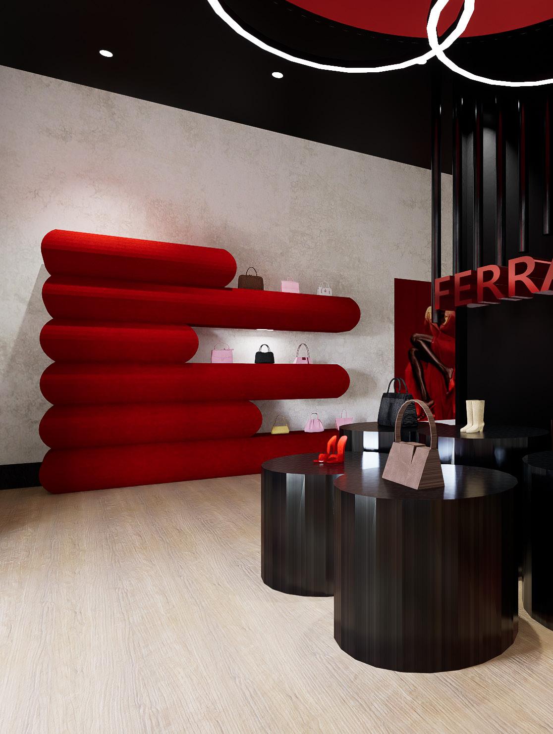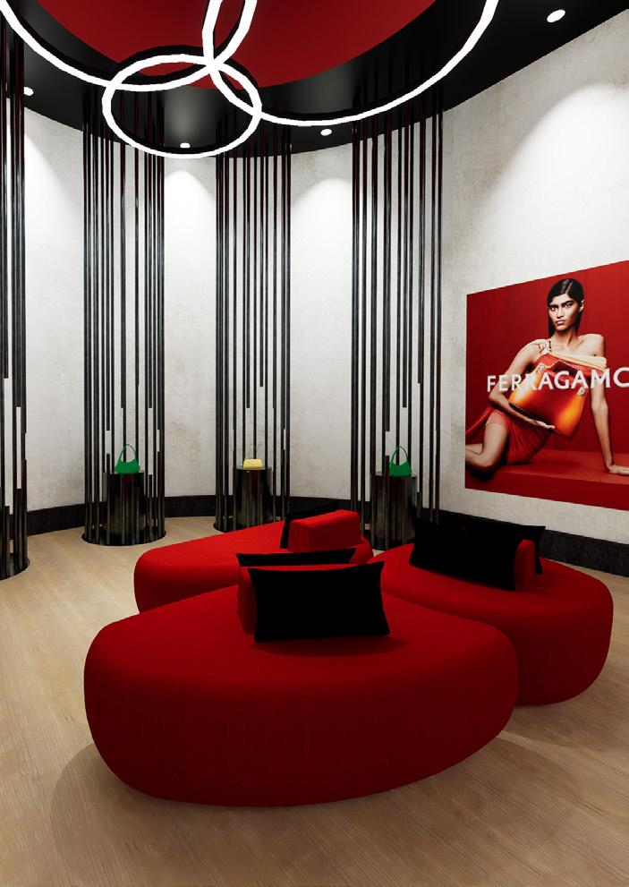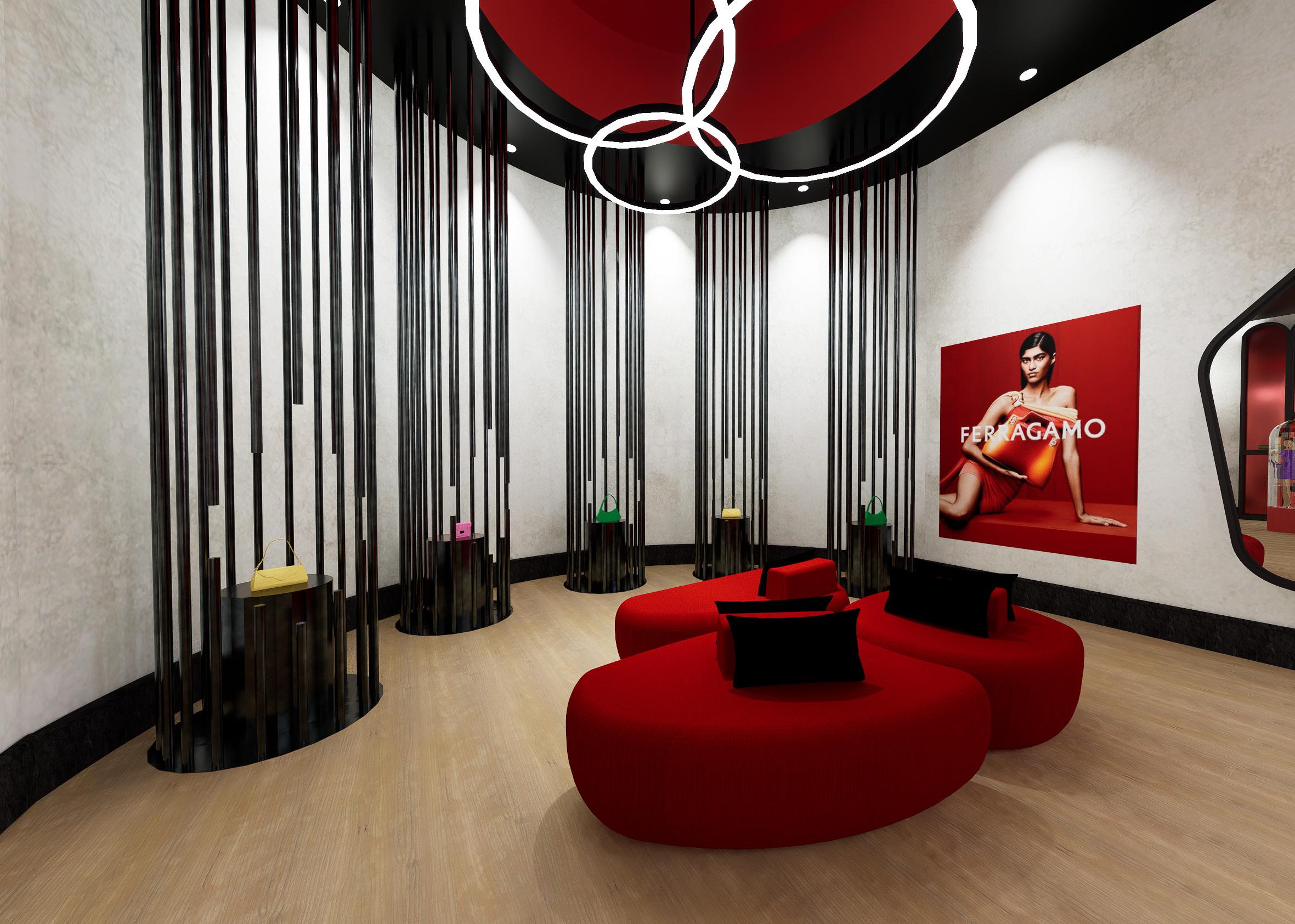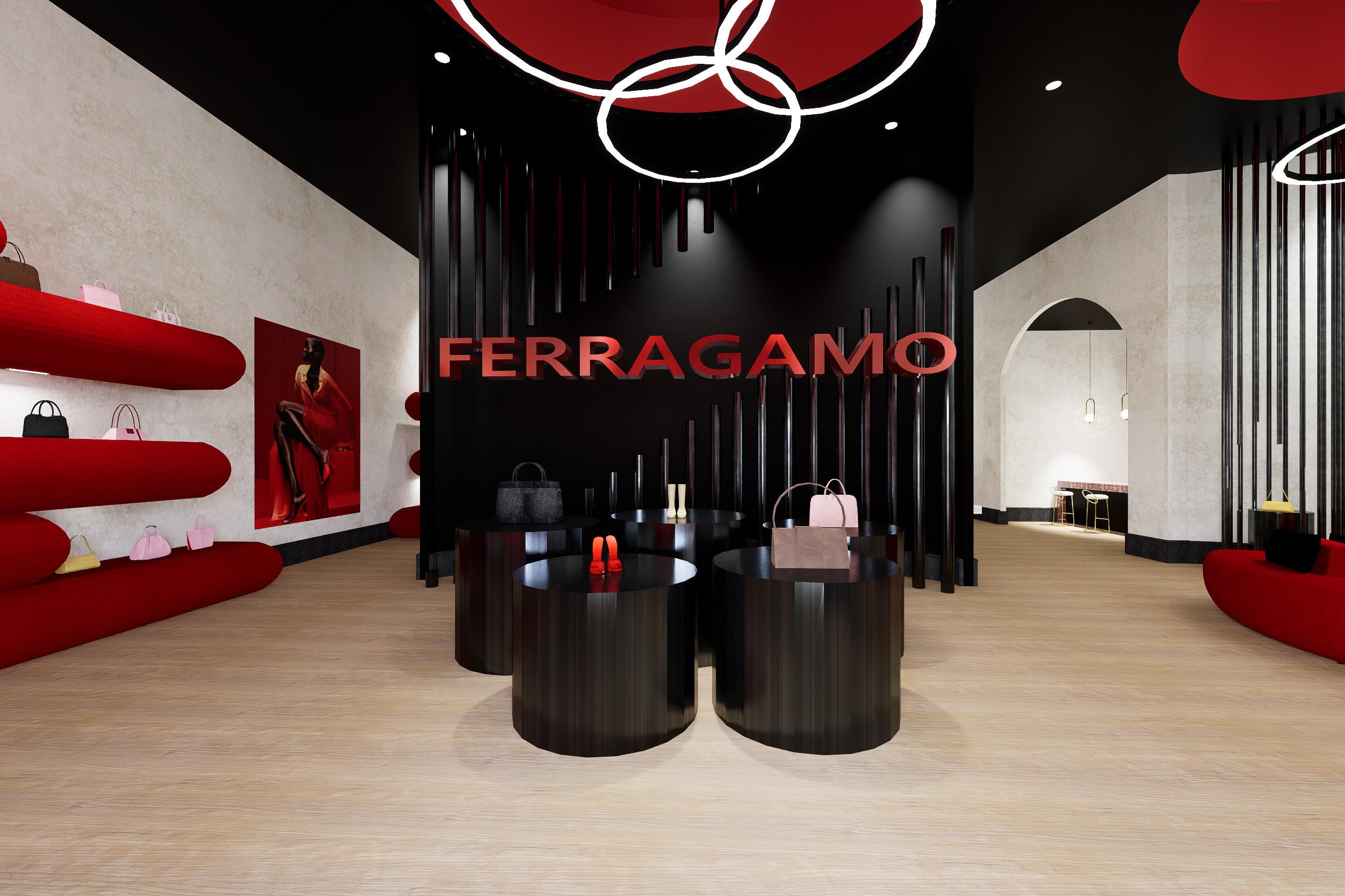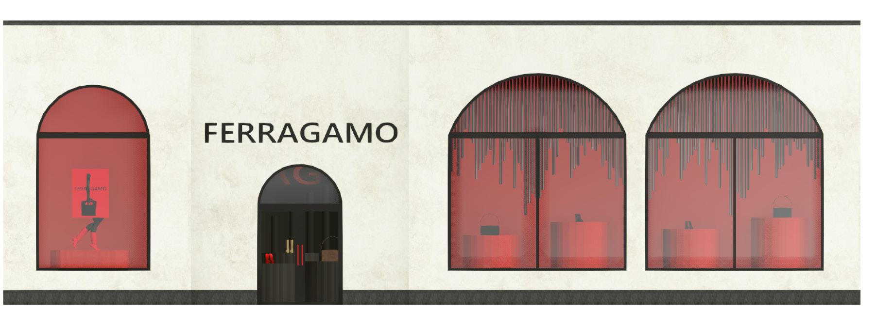 The storefront greets shoppers with Ferragamo’s iconic logo and bold brand colours, while creatively showcasing its luxurious products on custom-designed displays.