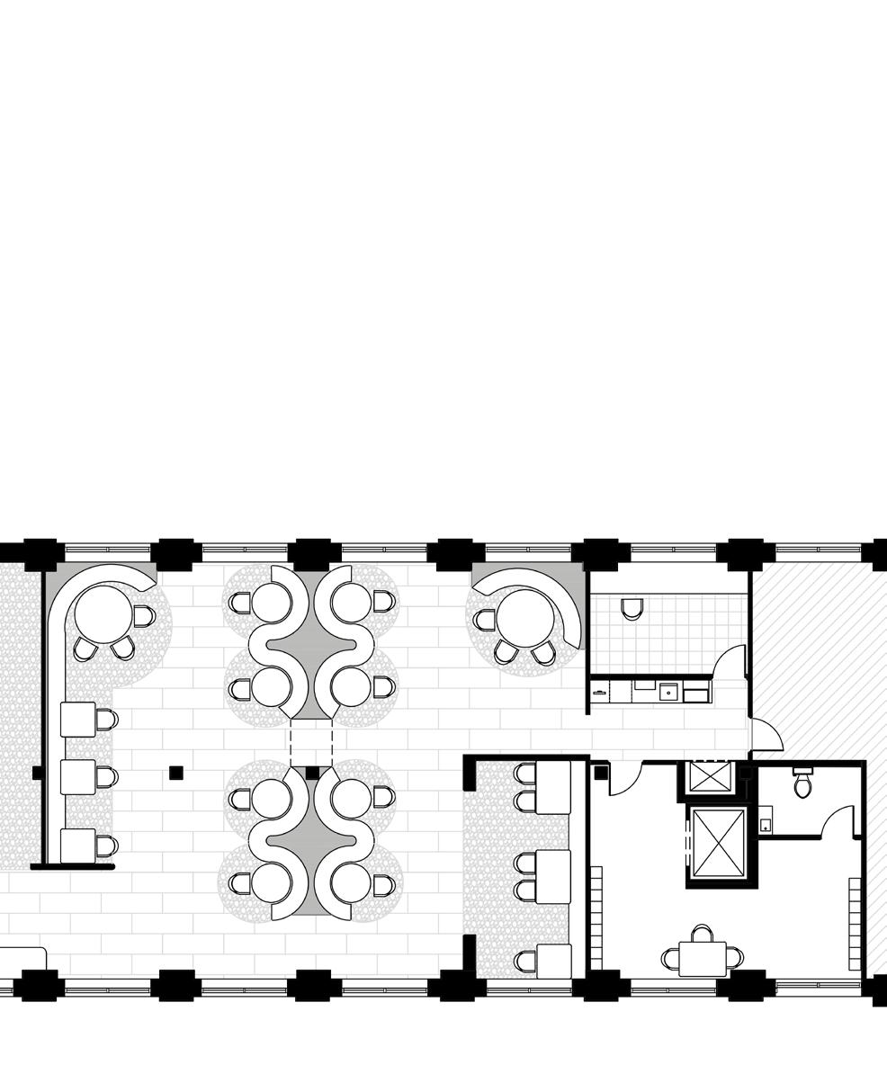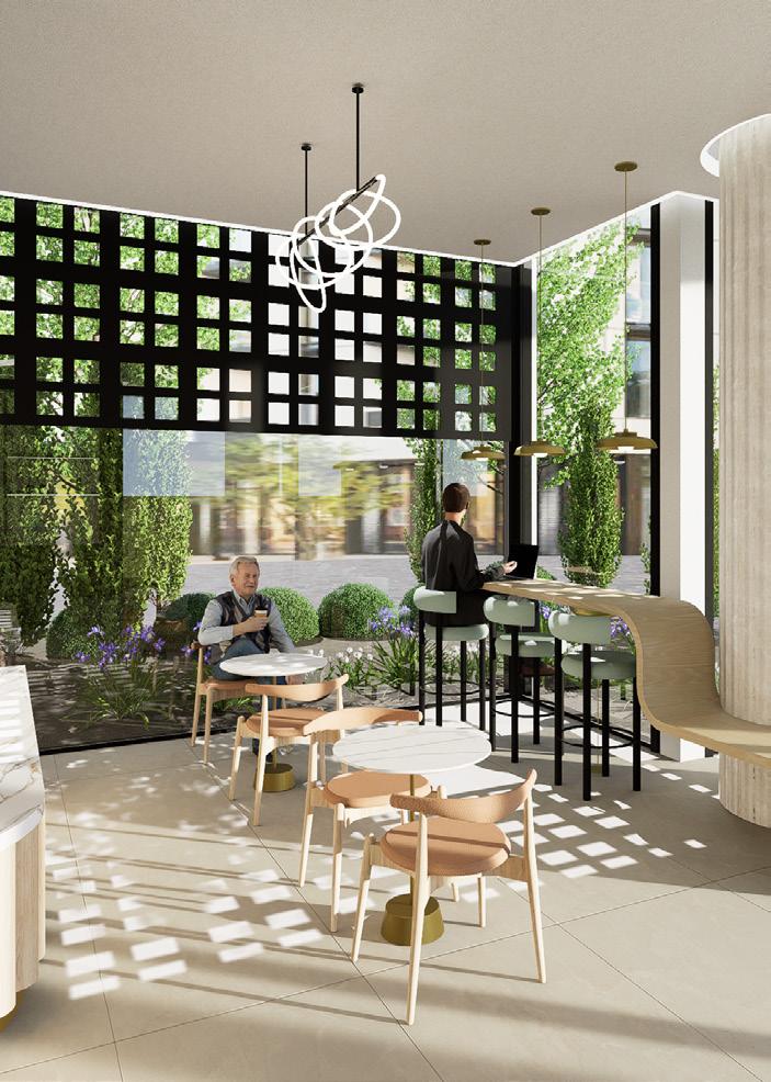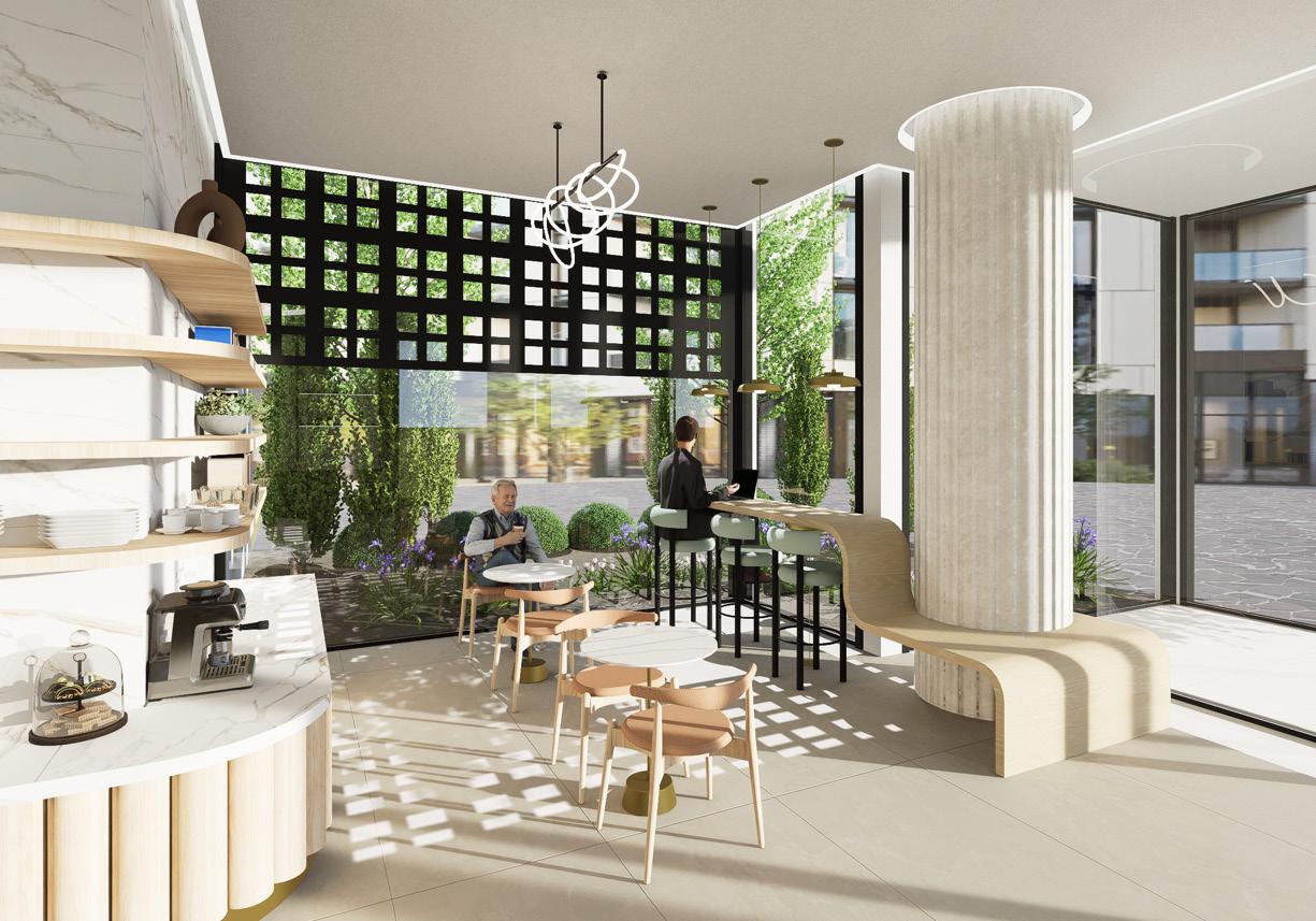 The café elevates the lobby experience by acting as a vibrant center for chance encounters. Thoughtfully designed to inspire and energize throughout the day, the café features layered lighting and comfortable seating options.