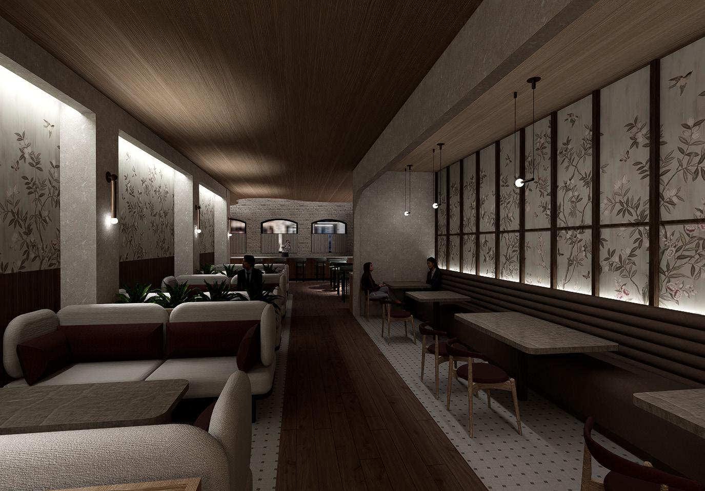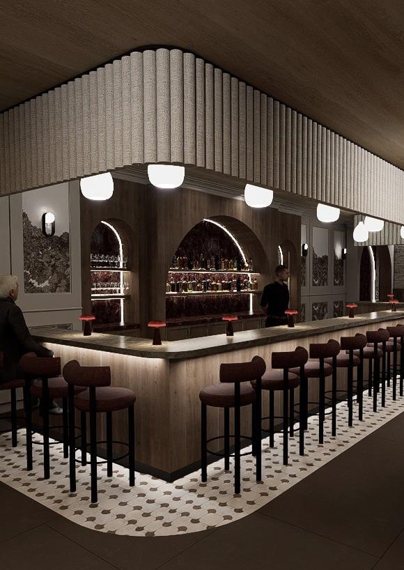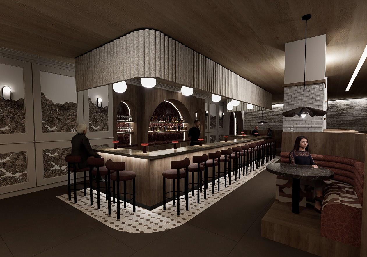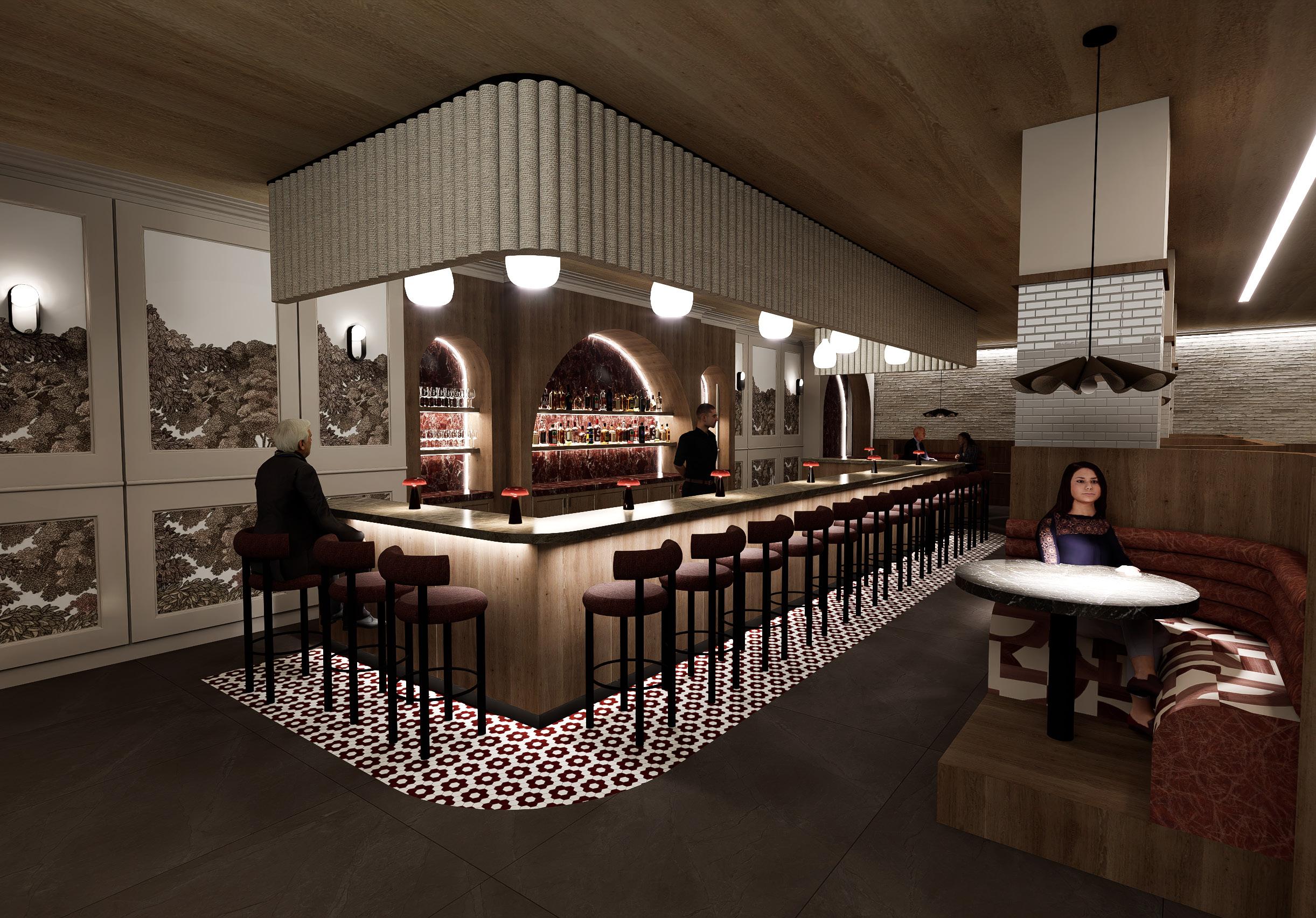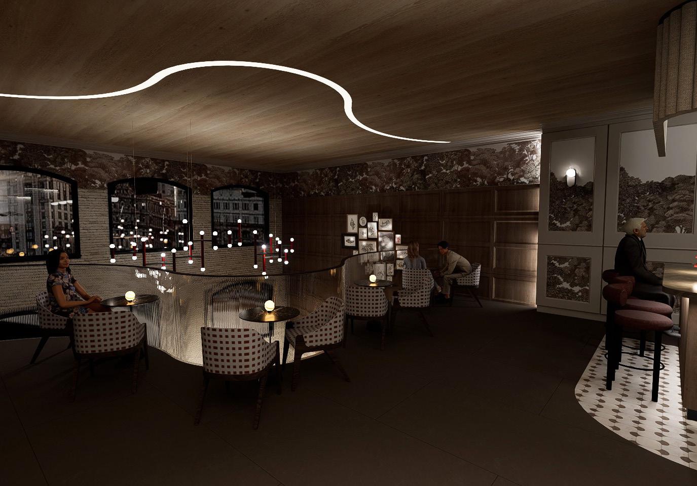 The bar lounge utilizes layered lighting to create a moody yet vibrant atmosphere, offering a warm and dynamic backdrop for evening drinks and small plates.