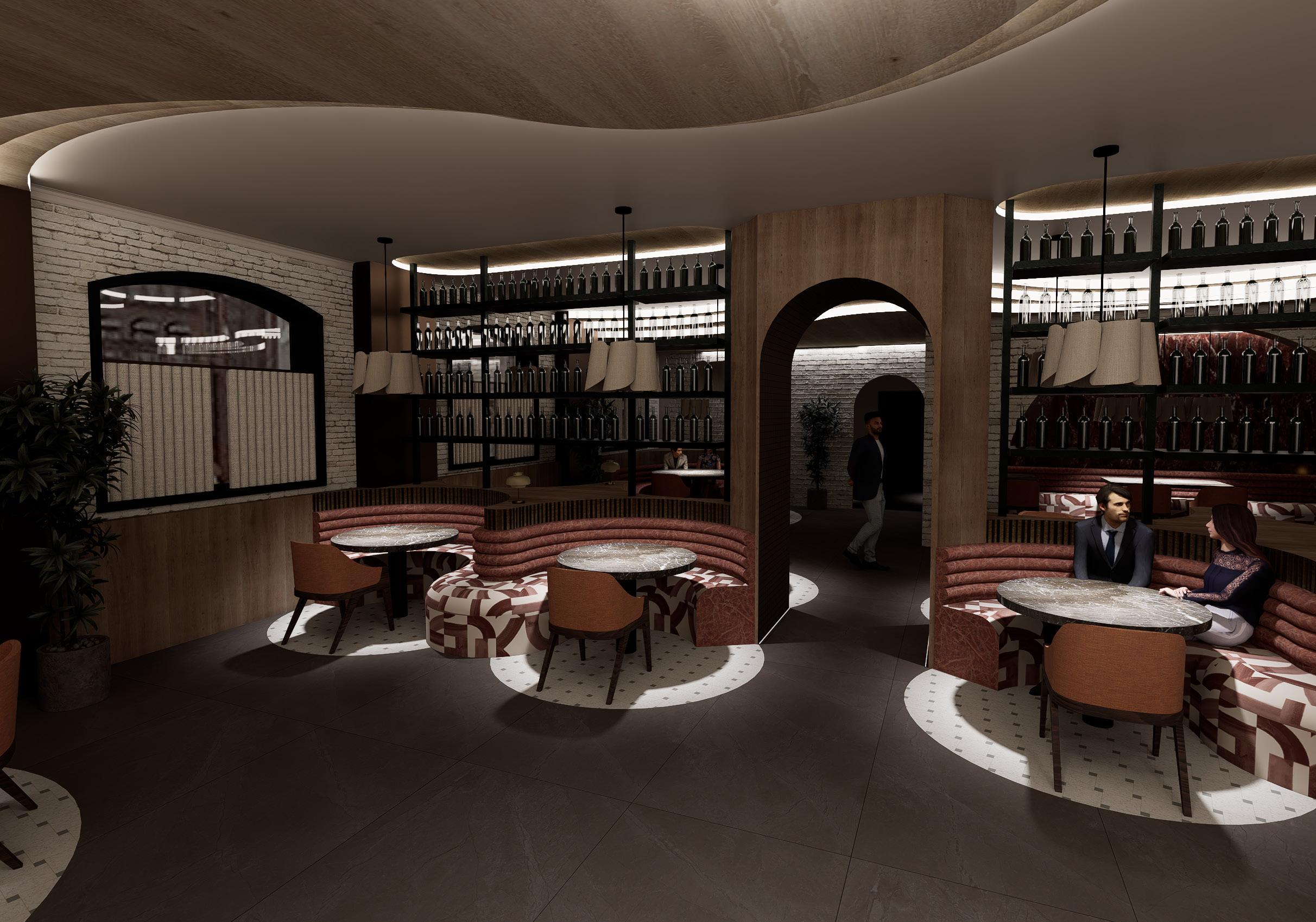The dining room features soft curves and rounded banquettes that create an inviting atmosphere, encouraging conversation and effortless sharing among guests.
