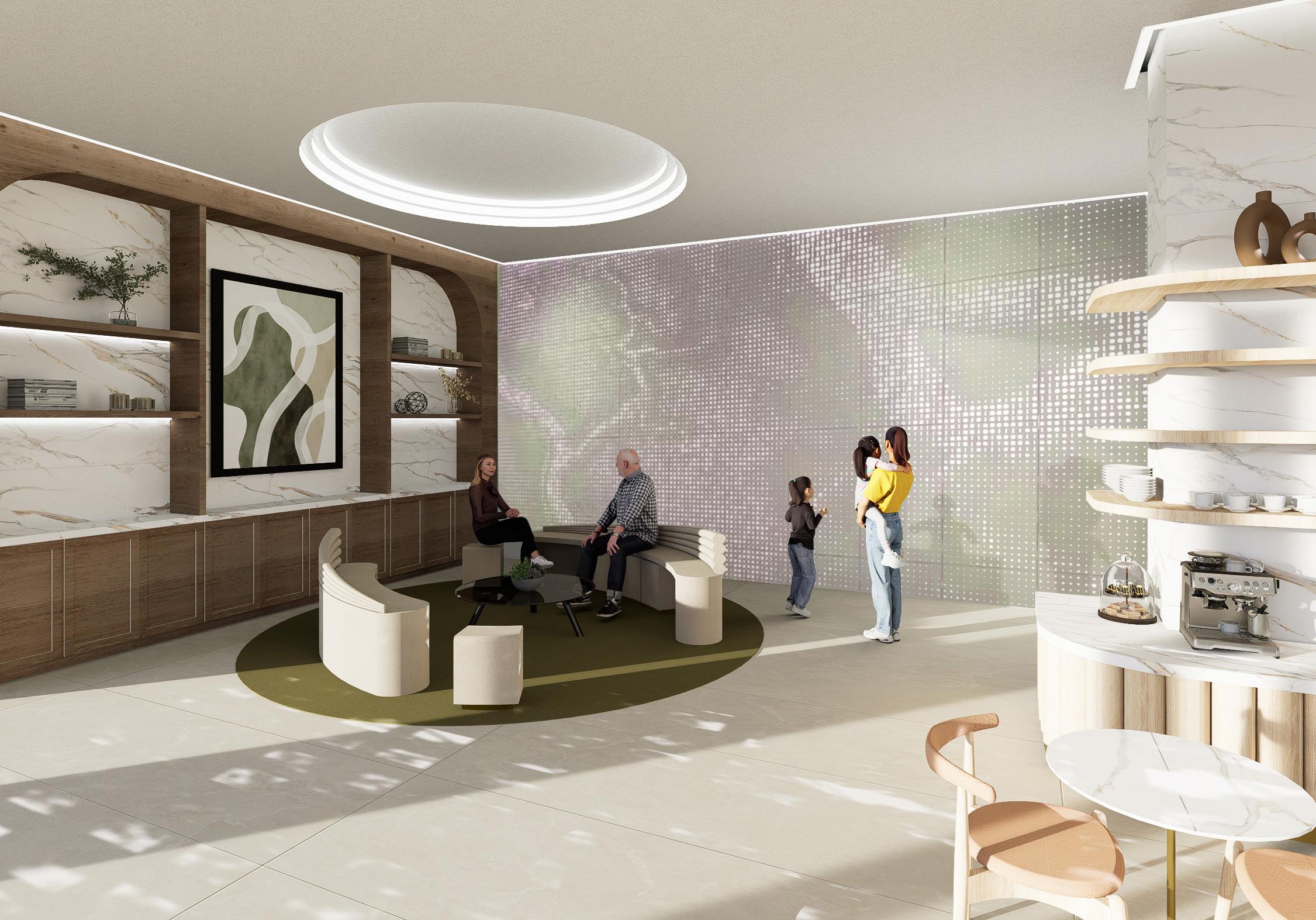 The large library wall, complemented by cozy seating, creates an environment that encourages accessible and intergenerational interactions. This flexible area can easily transform into a venue for community events.