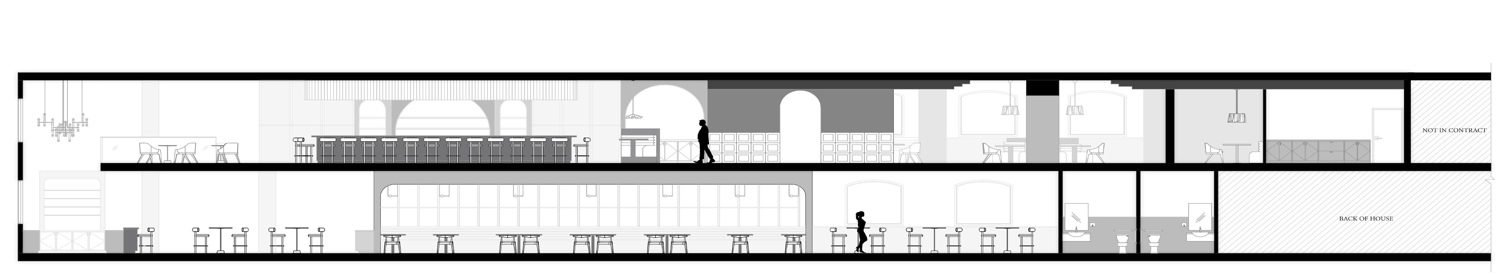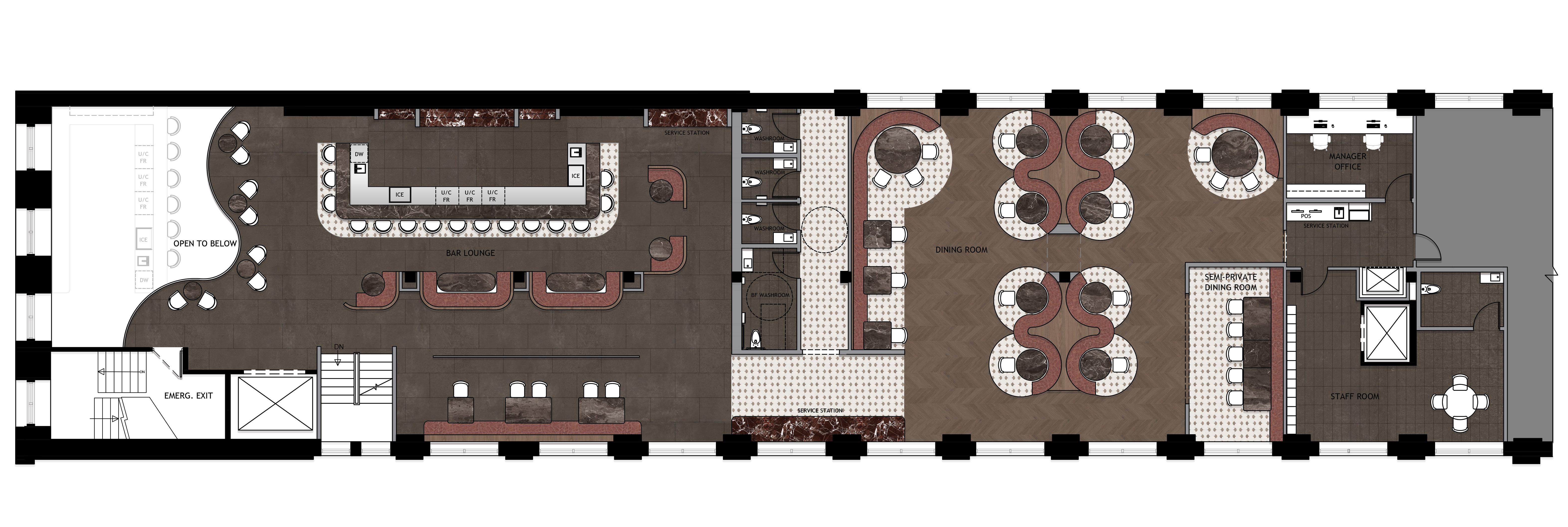 Rooted in the belief that dining is about shared experiences, the restaurant prioritizes small-group seating and thoughtfully arranged layouts that encourage conversation and ease. The ground level offers a relaxed lounge atmosphere, while the second level features a mezzanine bar and a formal dining room defined by curved booths that create intimacy within an open setting.