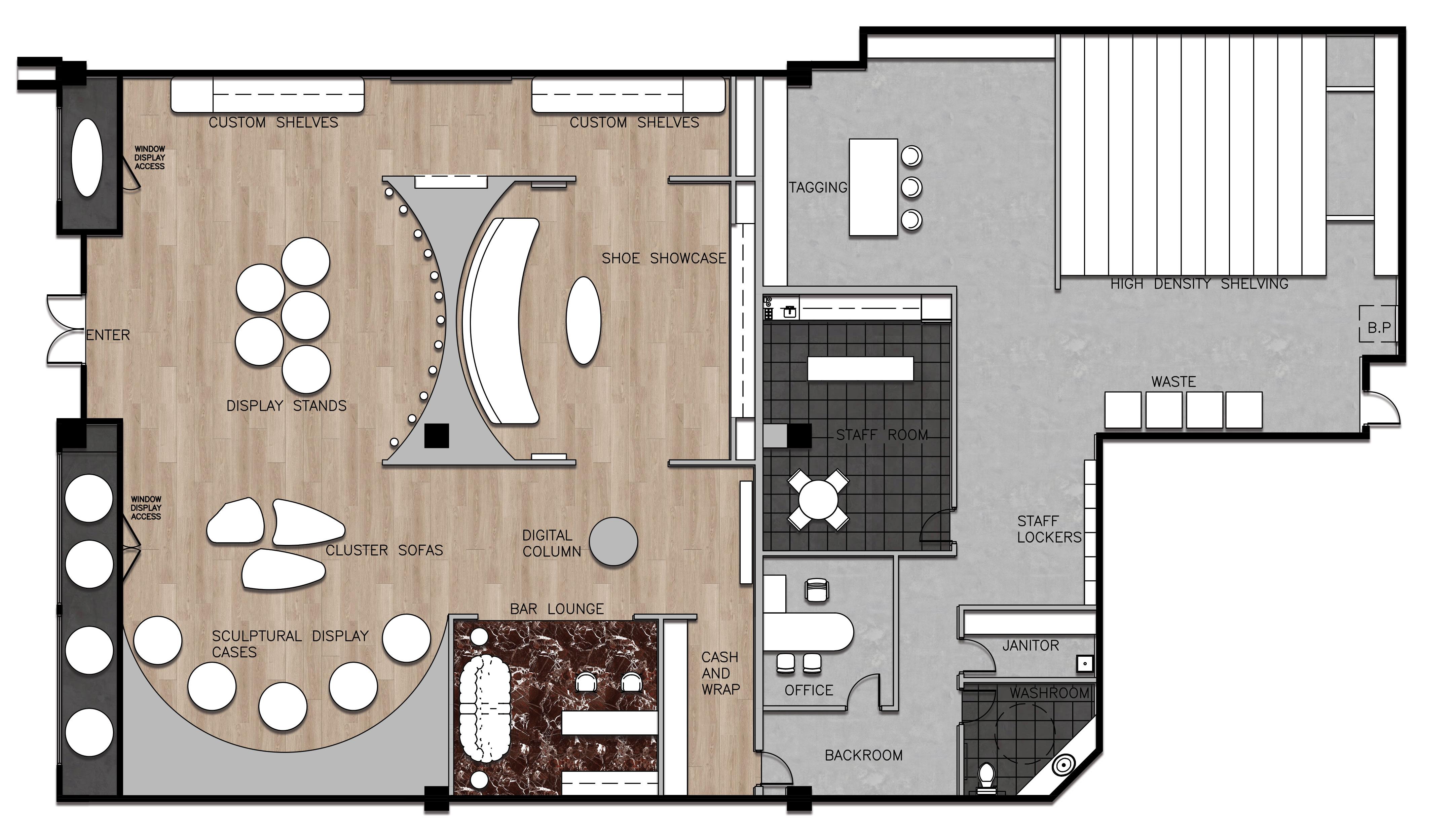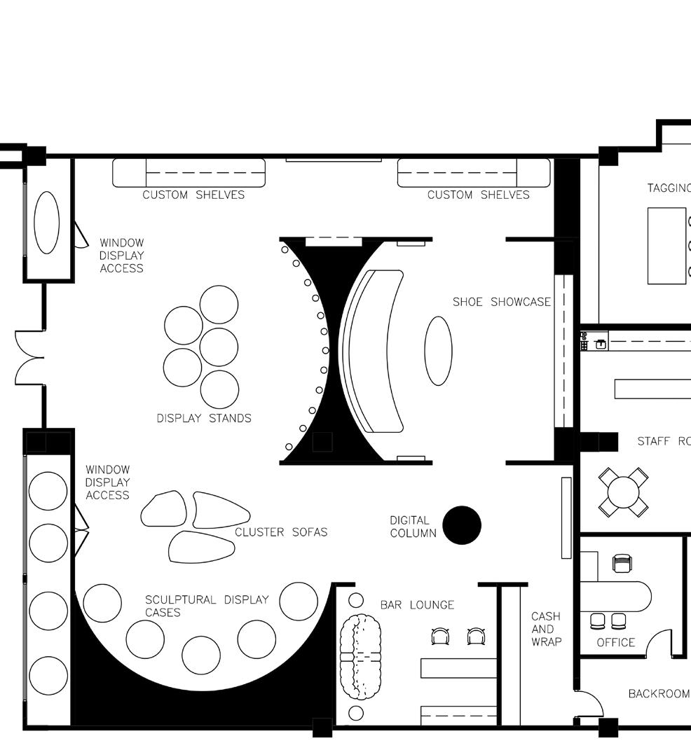Inspired by Salvatore Ferragamo’s use of form and material, our design concept places emphasis on the relationship between fashion and art. The goal was to create a retail space that mimics the movement and atmosphere of an art gallery and displays Ferragamo’s products as the art pieces.