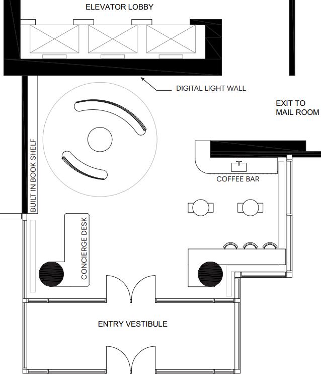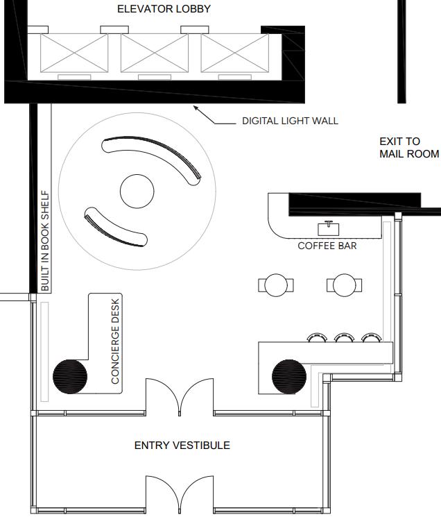 Our lobby, Crossroads, reimagines the condo lobby as a dynamic community hub. Flexible modular seating options and an inviting café help transform everyday encounters into meaningful connections.