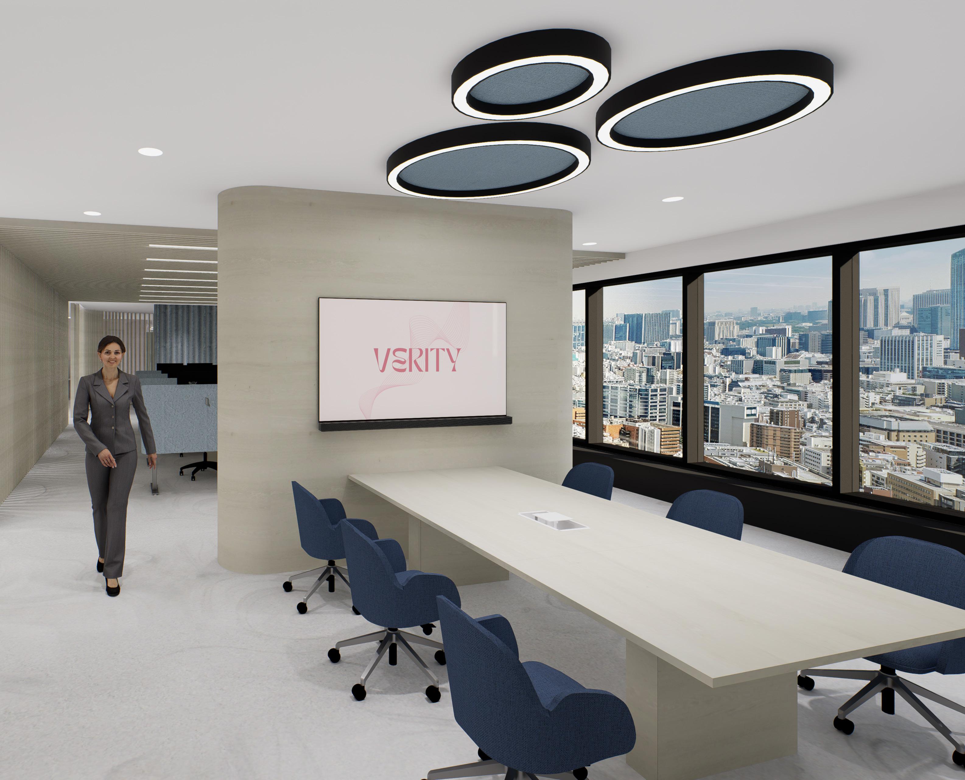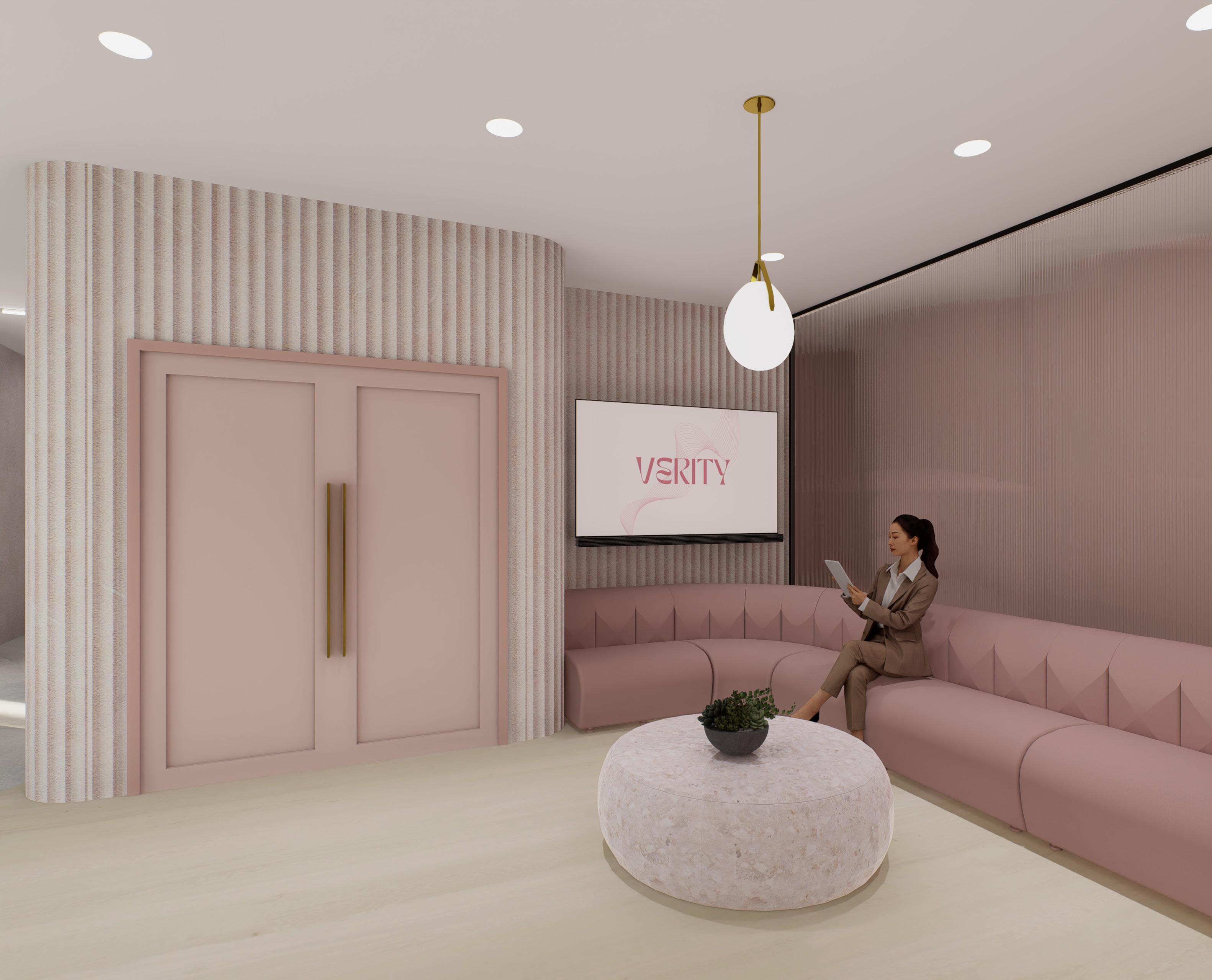 Verity is an advertising firm that specializes in representing makeup and skincare brands. This energetic office space has a direct impact on the wellbeing of employees and clients, by utilizing the principles of colour theory to select inviting hues of pinks, blues and greens. These colours were integrated into monochromatic spaces, creating a sense of cohesion and unity throughout the office.