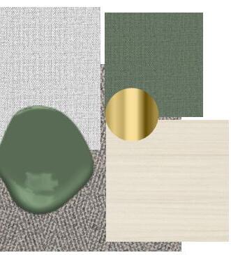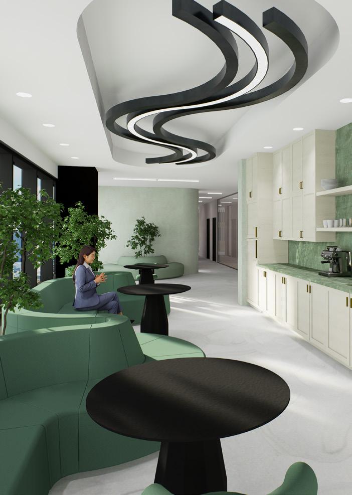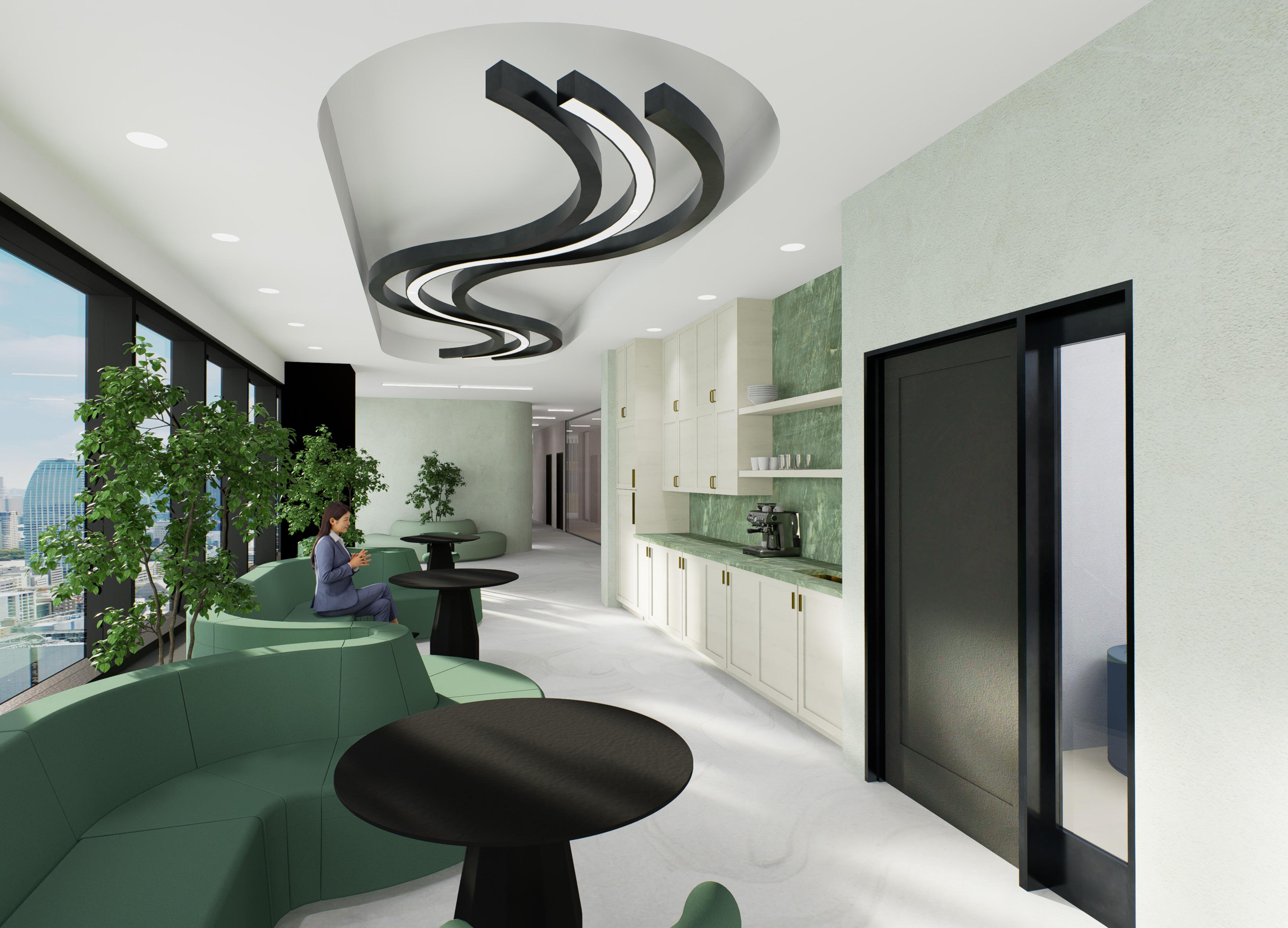 Shades of green are used throughout the café, private offices, and wellness room to create a calming atmosphere. In work environments, green is known to reduce fatigue, ease eye strain, and lower stress by evoking a natural sense of relaxation. To reinforce this effect, we incorporated living plants throughout the office, enhancing the overall freshness and serenity of the space.
