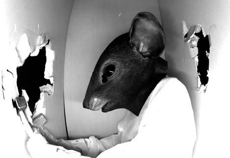 A bull’s-eye window is set in its center. Invited to immerse our gaze, with our eye pressed against the door, we find ourselves on the other side of the peephole, facing a creature that is part human, part animal, observing us before suddenly smashing the walls that surround it with a sledgehammer.