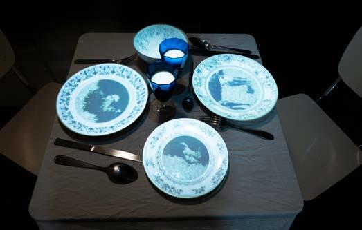 Evoking porcelain, the blue and white patterns come to life on the table and its plates. Projected animals and landscapes invite themselves into the dishes, echoing the presence of the living in our daily lives. Fragments of natural elements, including animals and plants, each remind us of our connection to the complexity of ecosystems that end up on our plates. Here, the living intersects with the art of the table to question our relationship with what we consume.