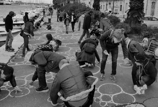 At the beginning, there is nothing but a street, its cobblestones, a pile of chalk, and a large gathering. Everyone is invited to trace a simple, repeated geometric shape with chalk. Little by little, the isolated act multiplied gains significance through the group; urban poetry takes shape, and the fleeting artwork takes over the neighborhood with just a bit of white chalk left by each person on the black pavement. The pattern spreads like soap bubbles in a breath, and the drawing quickly extends as far as the eye can see. In less than an hour, the place is completely transformed. The participation of each person makes the work possible, surprising, impressive, monumental.