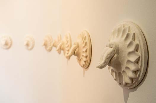A sculptural installation that blends architectural ornamentation with human expression. It questions our relationship to language, truth, and social conventions.
