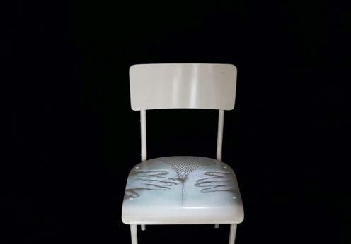 An uncomfortable seat revealing our inability to remain still and quiet for even a minute without moving. This installation draws inspiration from the weight of our bodies as they stick to the chair in the summer, unabashedly analyzing the impressions on our skin and the gestures left by our hands on our bodies in this daily choreography. Inertia meets the living, and the living breathes life into the inanimate without shame.