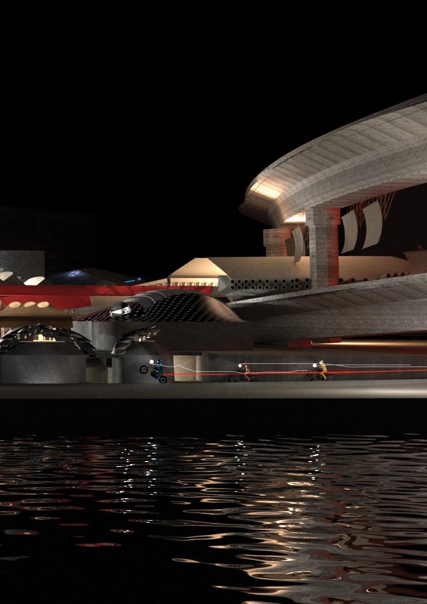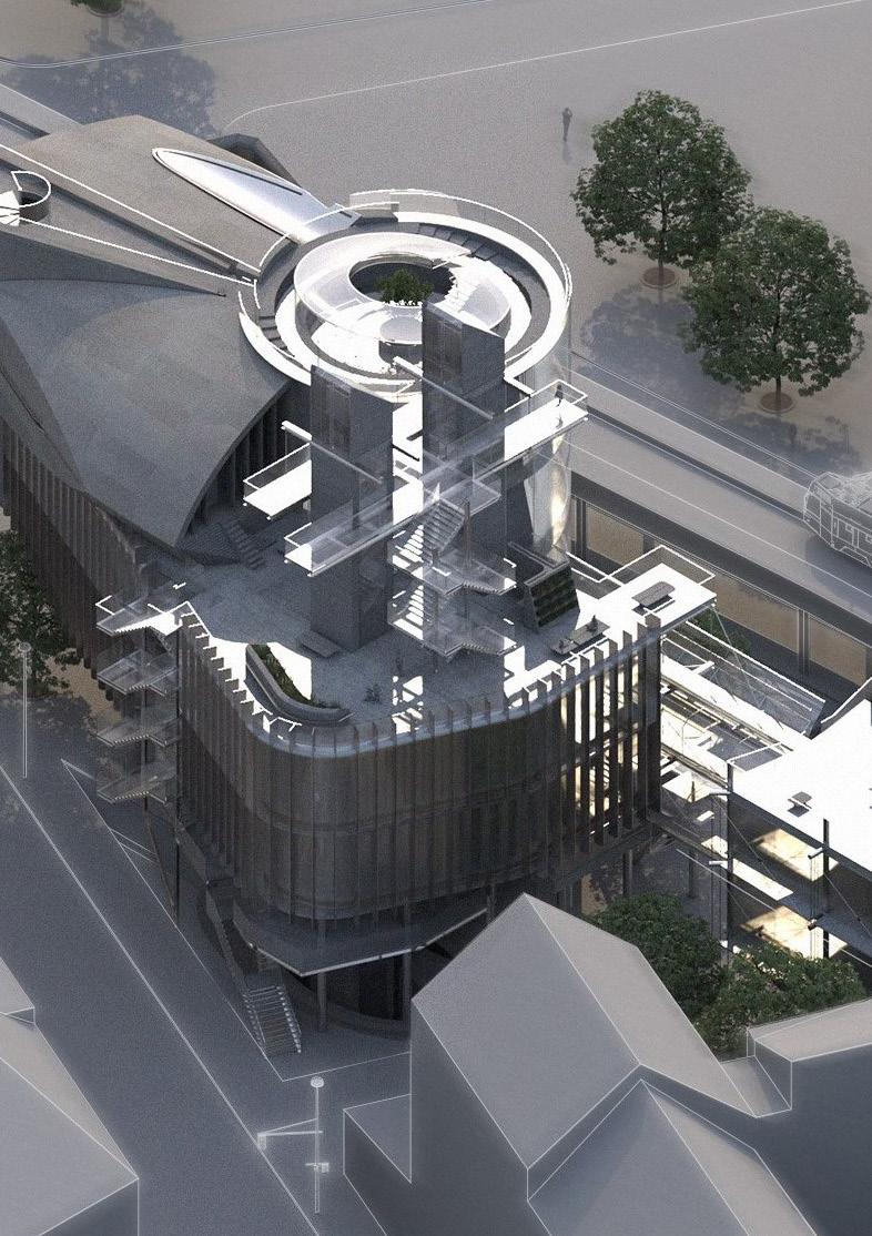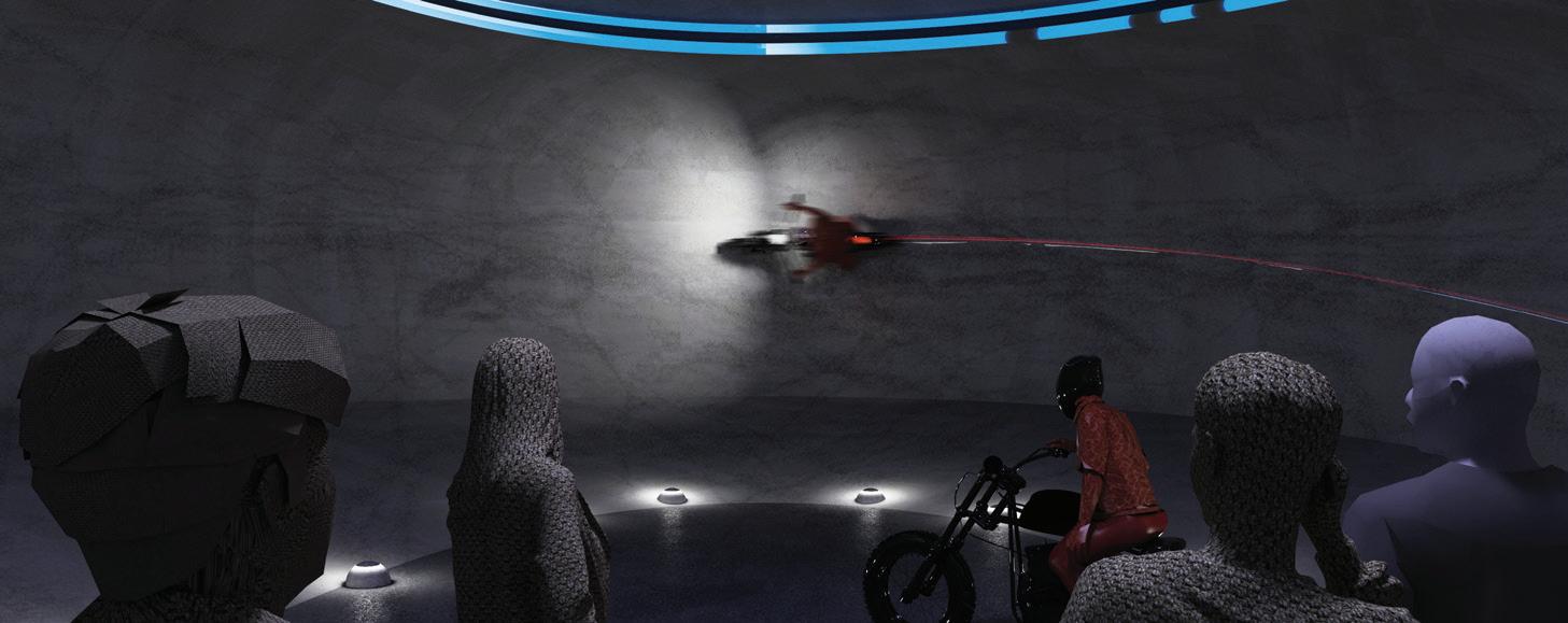 Situated in Mitte, the central district of Berlin, the building brings together bikers and observers to engage in a celebration of the intense sounds of the motorcycle. The building proposes a new mode of motorcycle performance. Through the acoustic design of the motorcycle track that weaves its way through the building, different sonic environments are activated by the rider for specific performative requirements. As the motorcycle travels through the building the sonic environments respond to the bike and perform their own song. myles.green.20@ucl.ac.uk