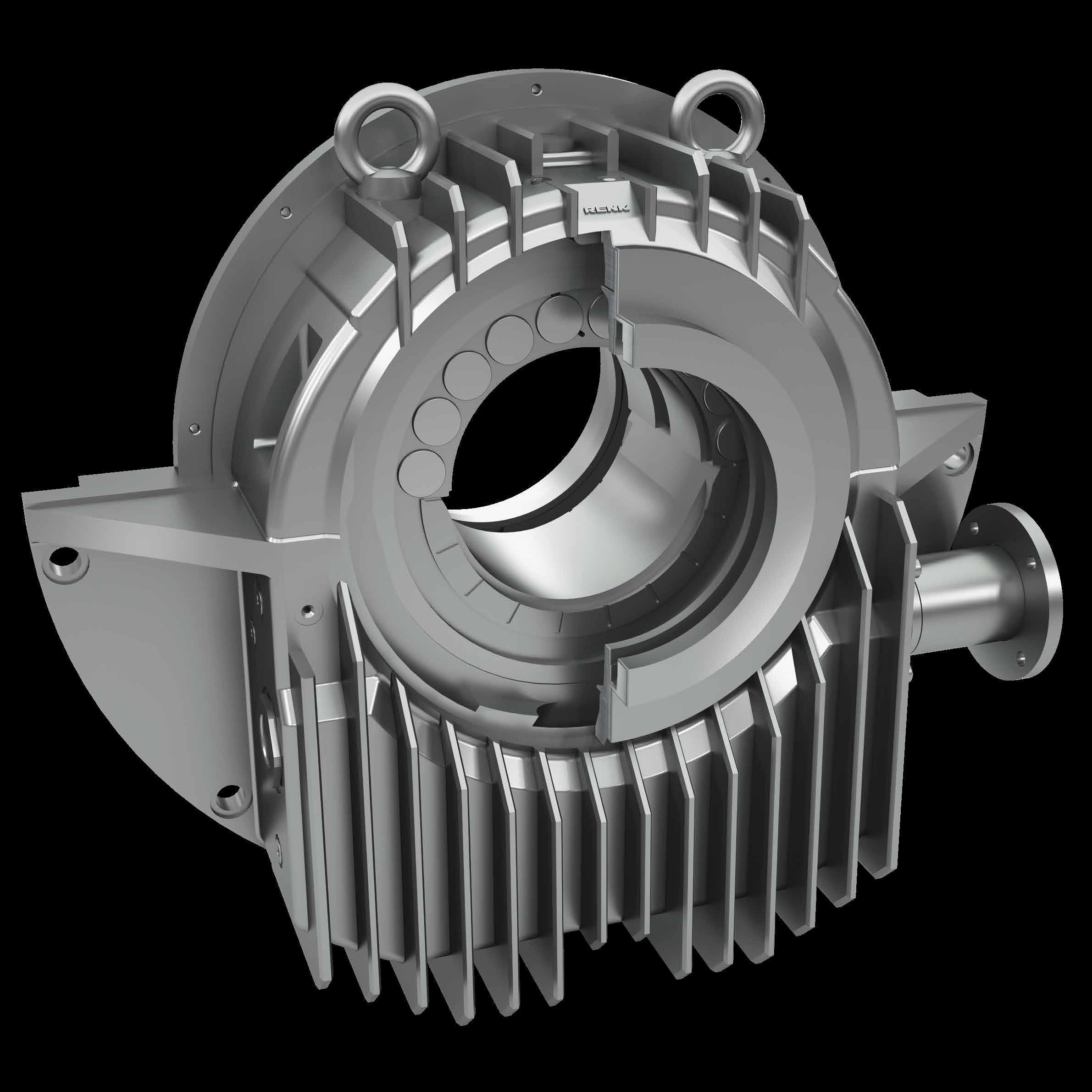 The finned EM-type housings are made from a high-quality cast iron (EN-GJL- 300) and are designed for heavy duty performance. Other materials such as, for instance, nodular cast iron EN-GJS- 400-18-LT can be supplied by special arrangement. Tapped holes for thermometer, oil inlet and outlet, oil sight glass, thermometer in the oil sump or suction line of a circulating pump are available on either side. For special cases (e. g. fitting of oil coolers or vibration detectors) finish machined housings are taken from stock and provided with additional connection holes.