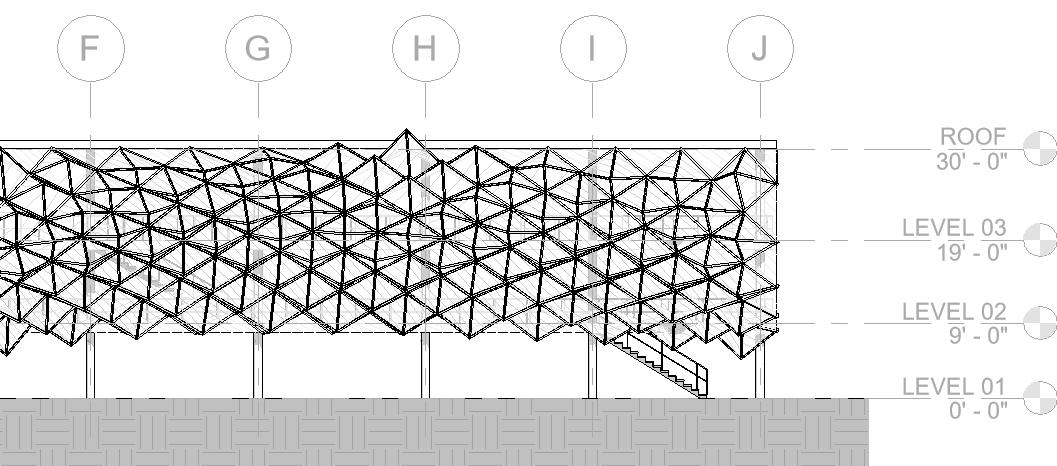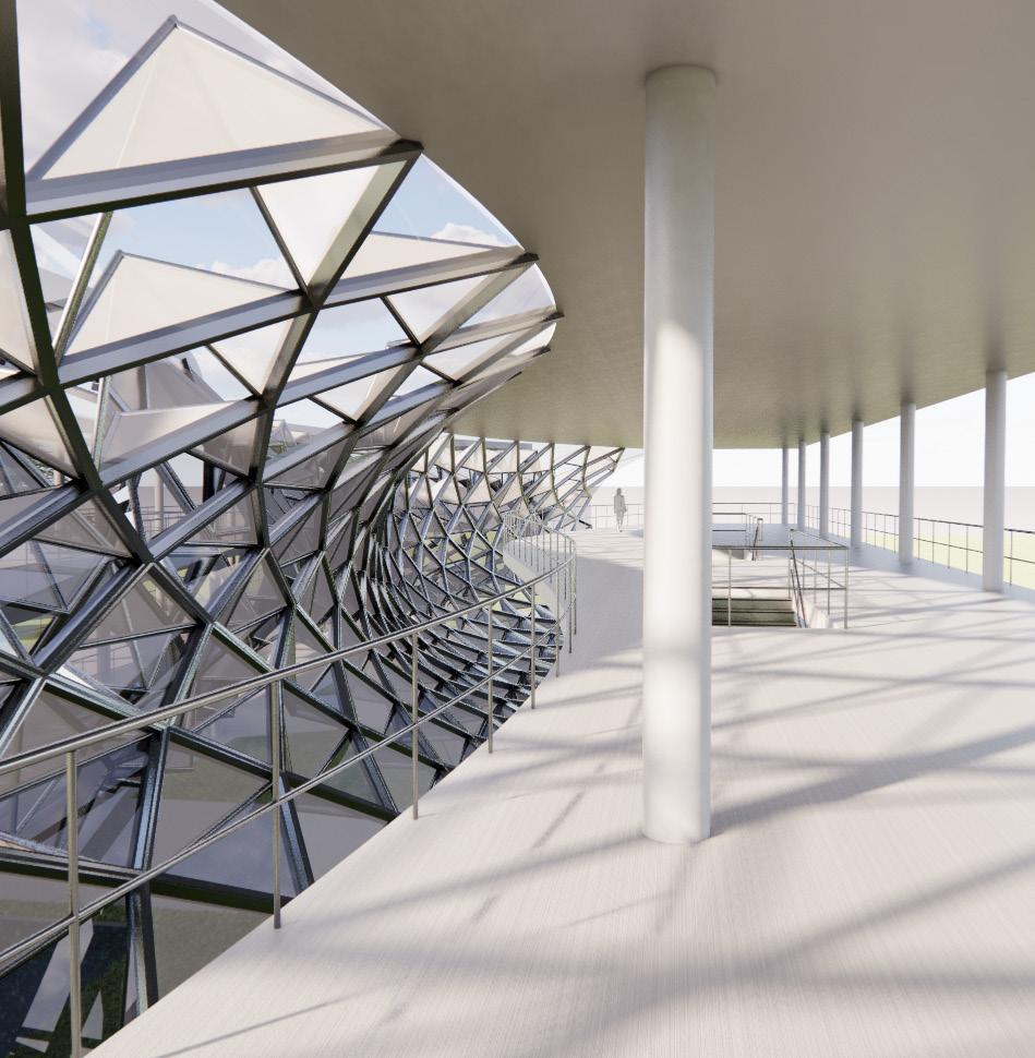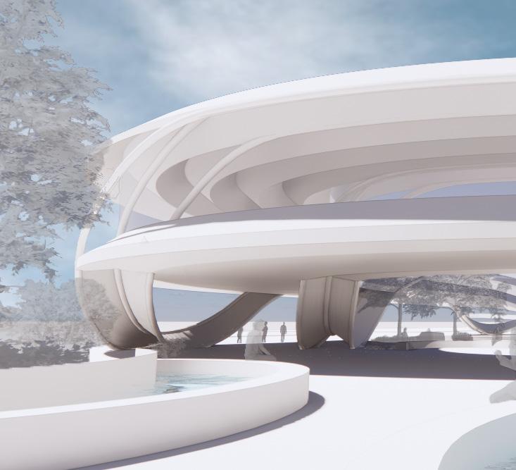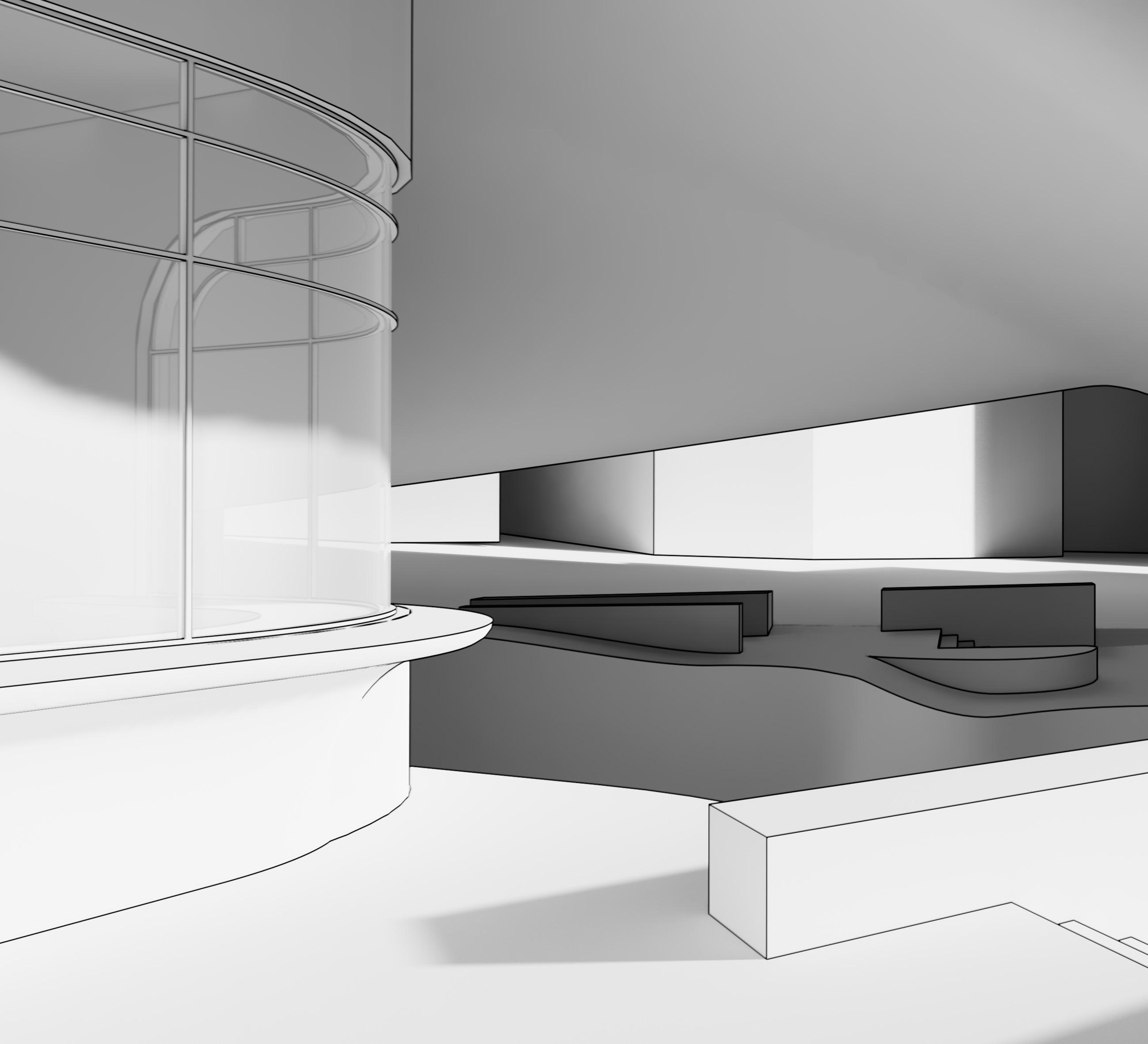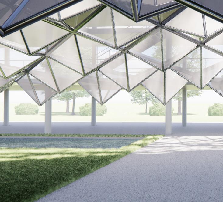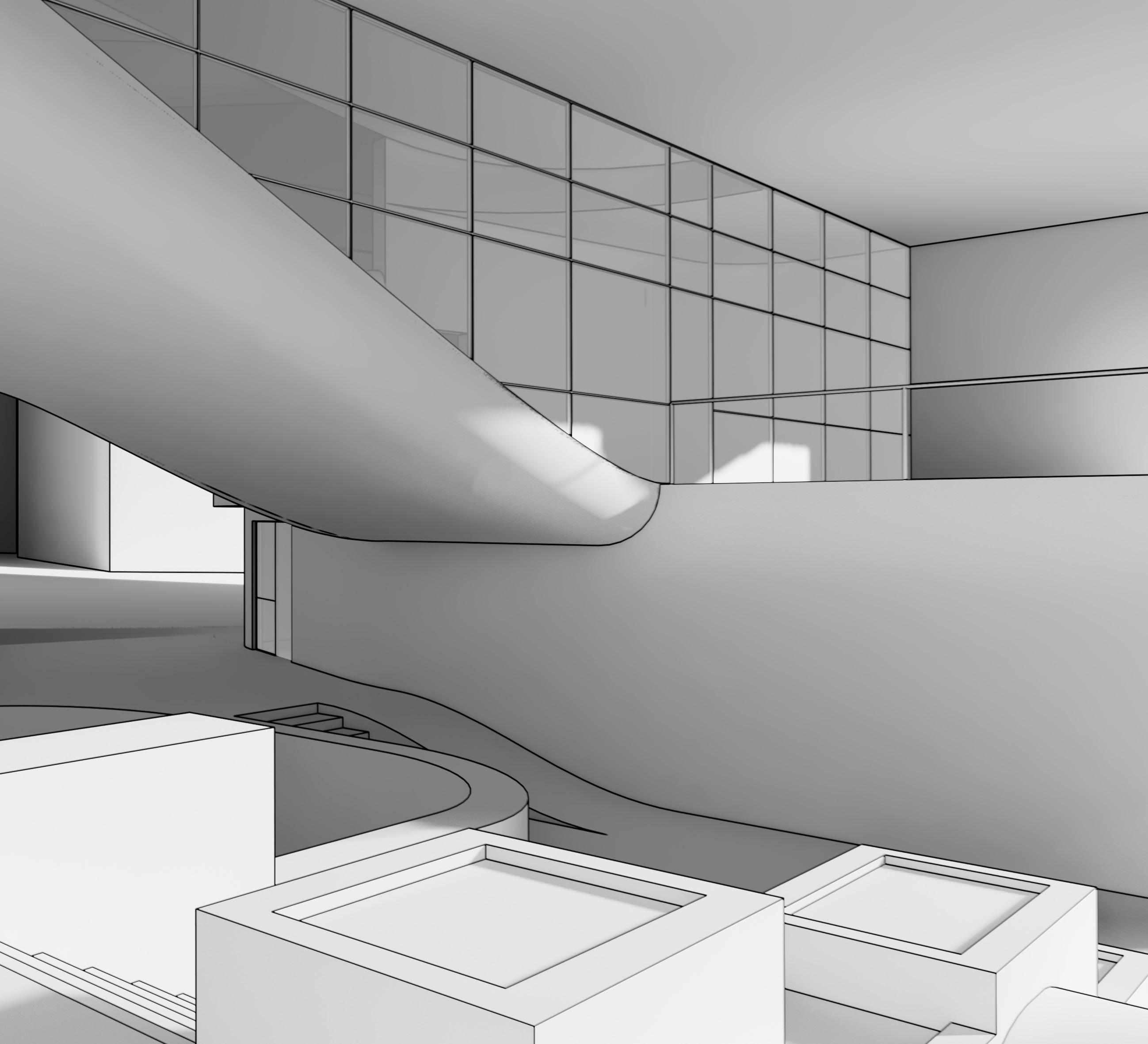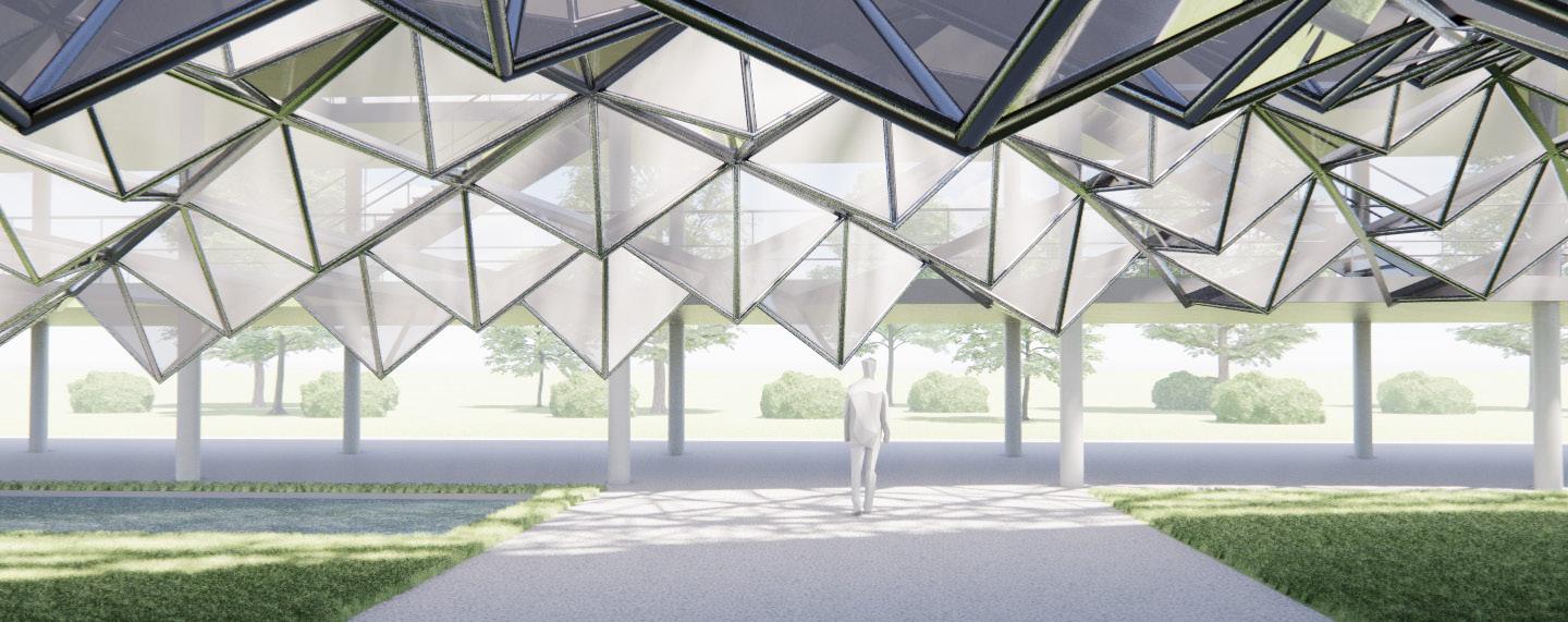 The Crystal[line] employs as open piloti design divided with a curve that holds a crystalline glass structure. The whole project, modeled in Revit, was scripted using Rhino.Inside which allows elements to be created and manipulated using Grasshopper. This was used to apply different parameter values to the custom curtain wall panel family using attractor points.