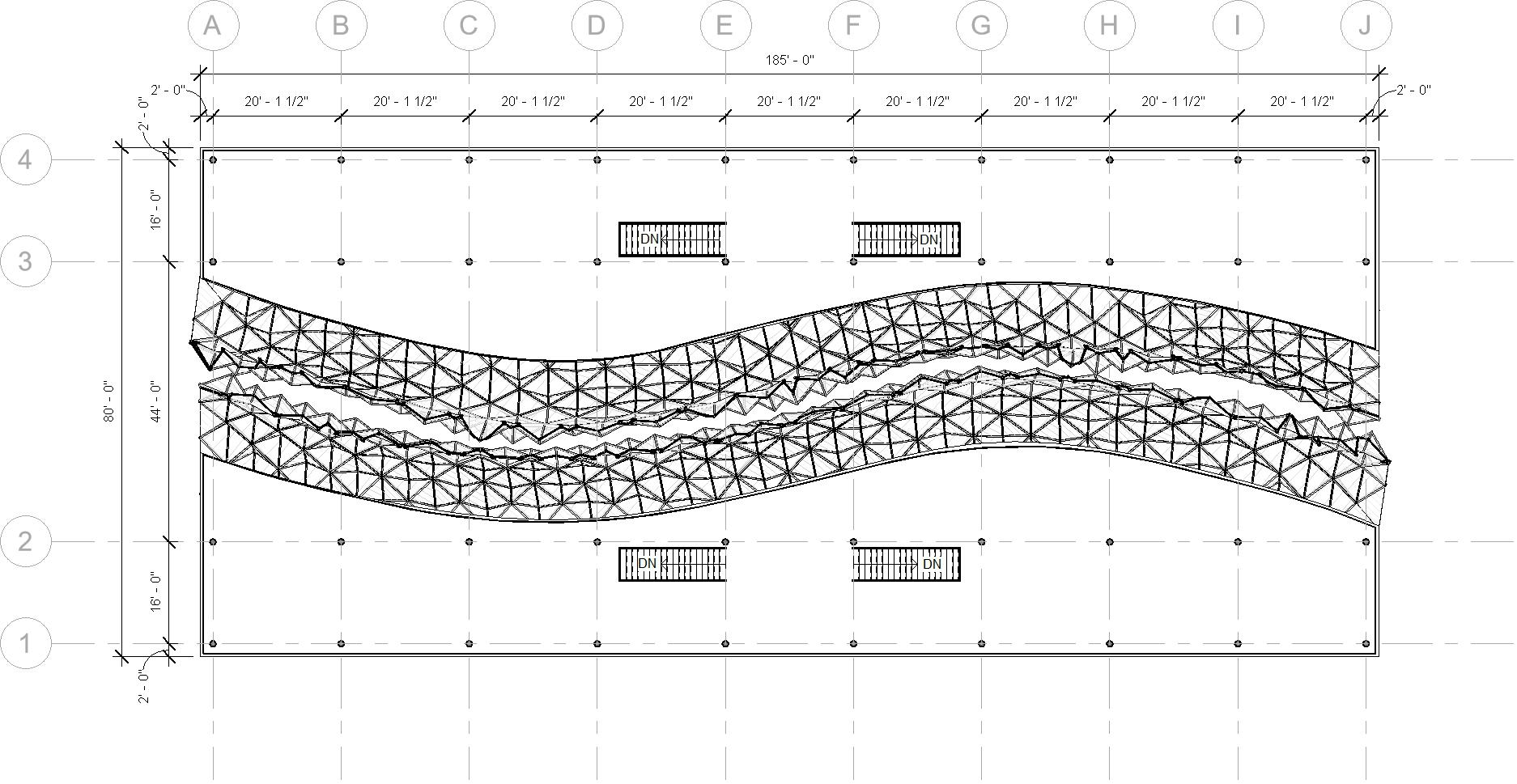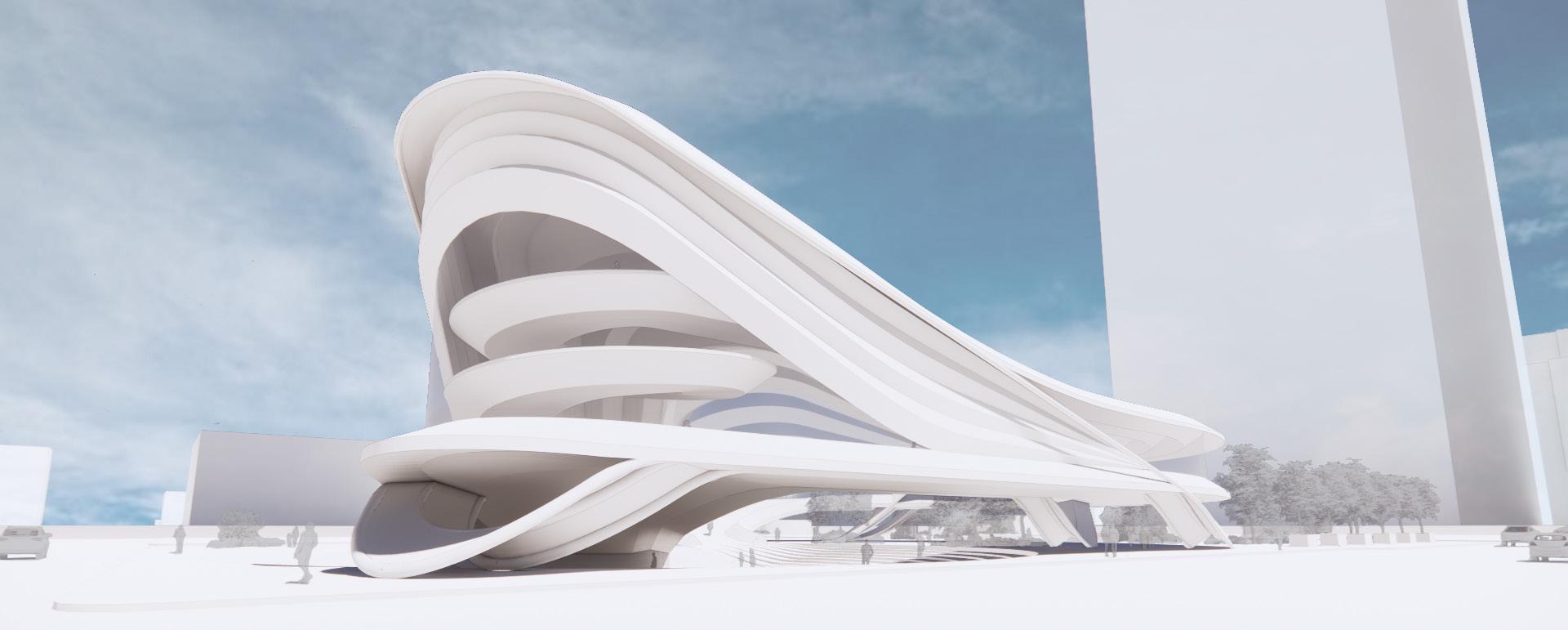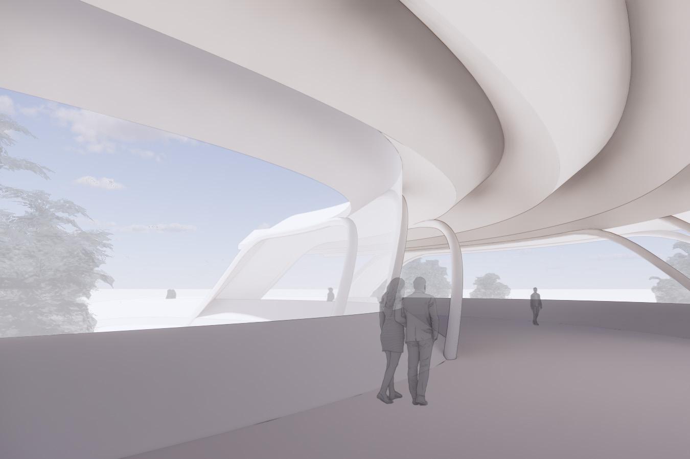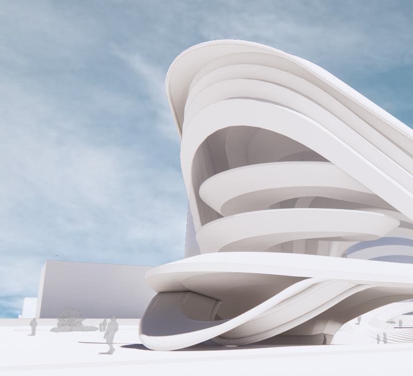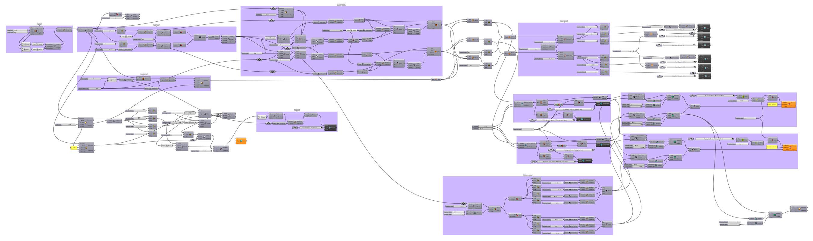 The Crystal[line] employs as open piloti design divided with a curve that holds a crystalline glass structure. The whole project, modeled in Revit, was scripted using Rhino.Inside which allows elements to be created and manipulated using Grasshopper. This was used to apply different parameter values to the custom curtain wall panel family using attractor points.