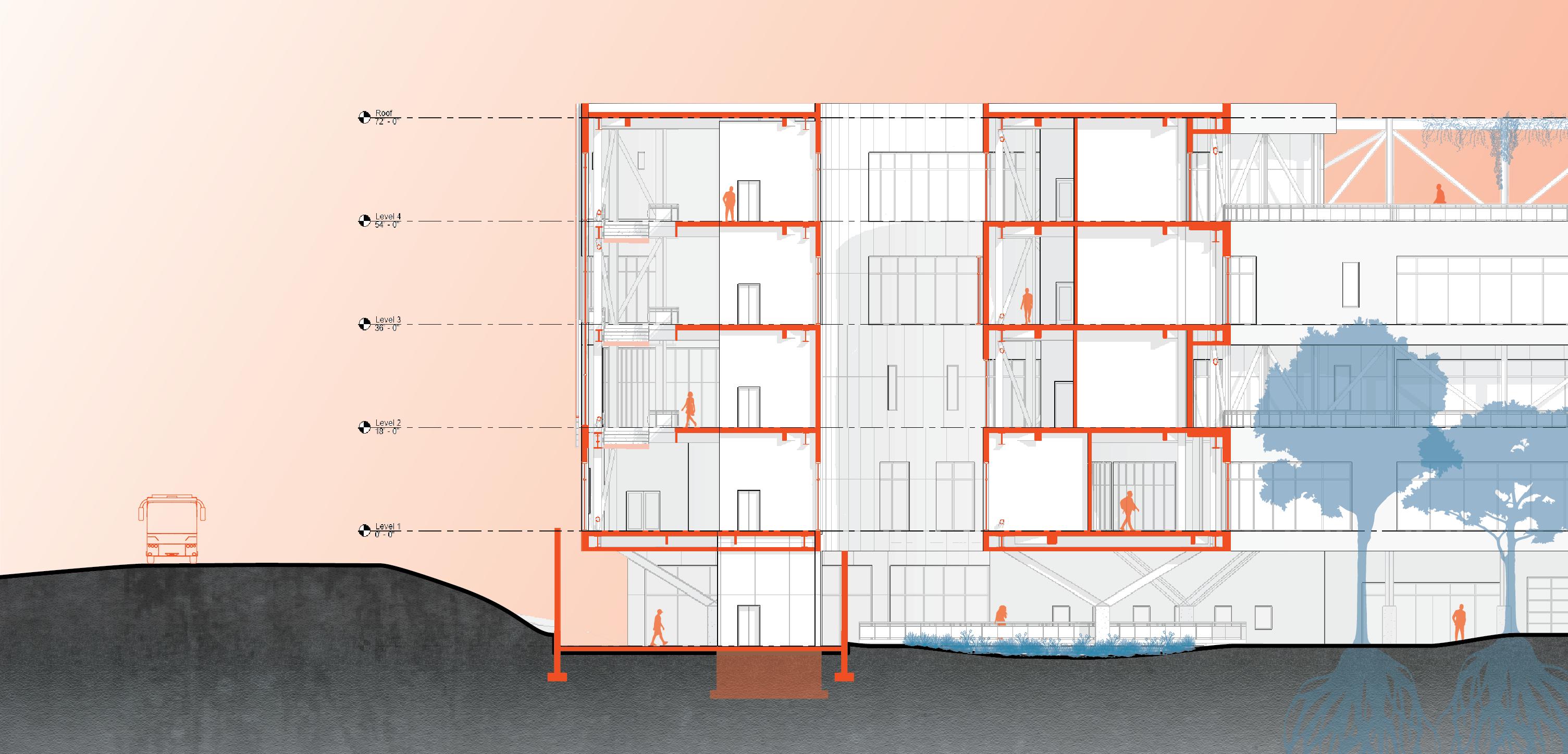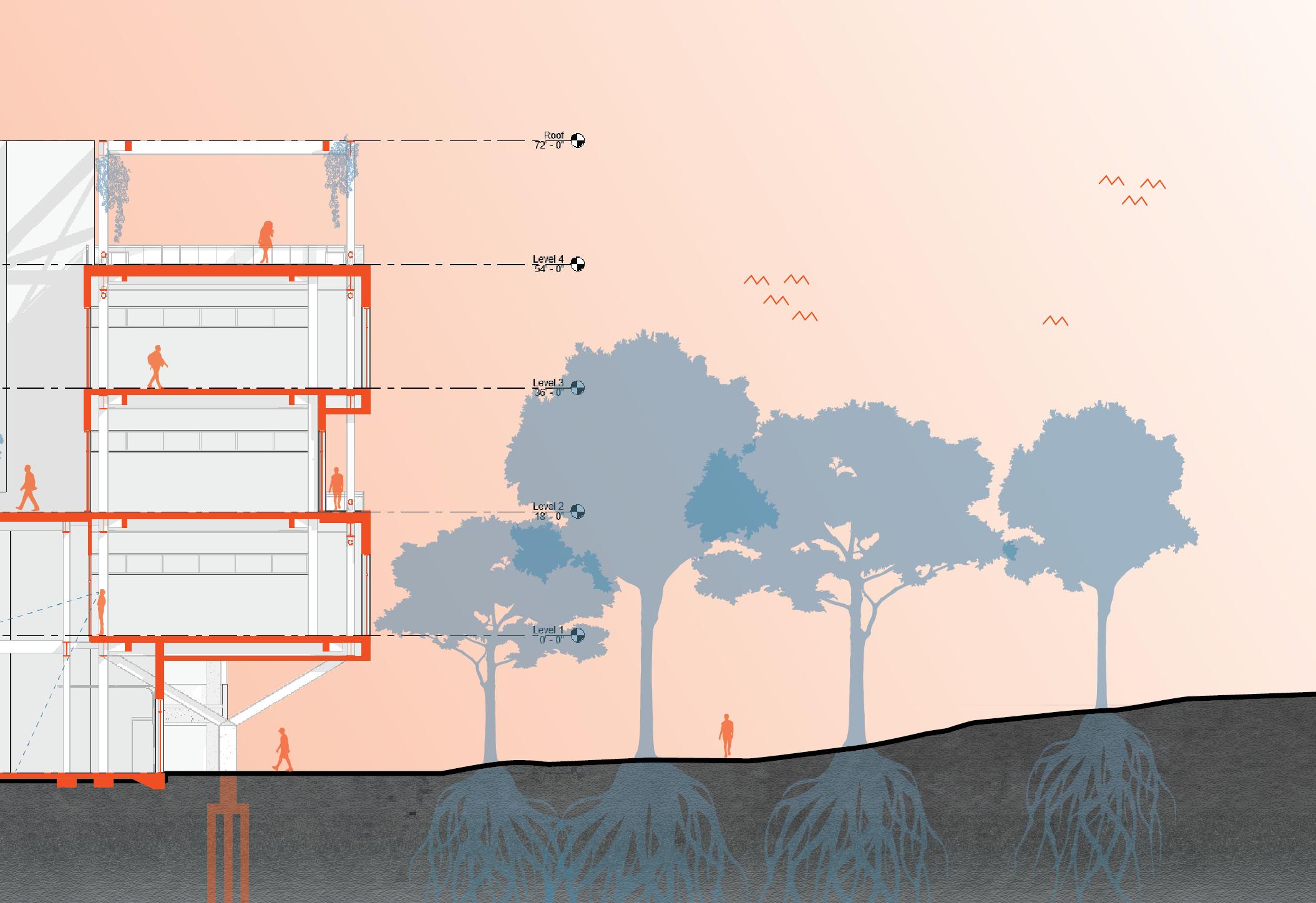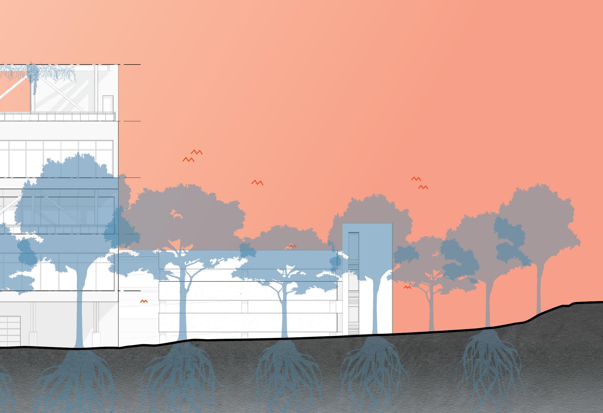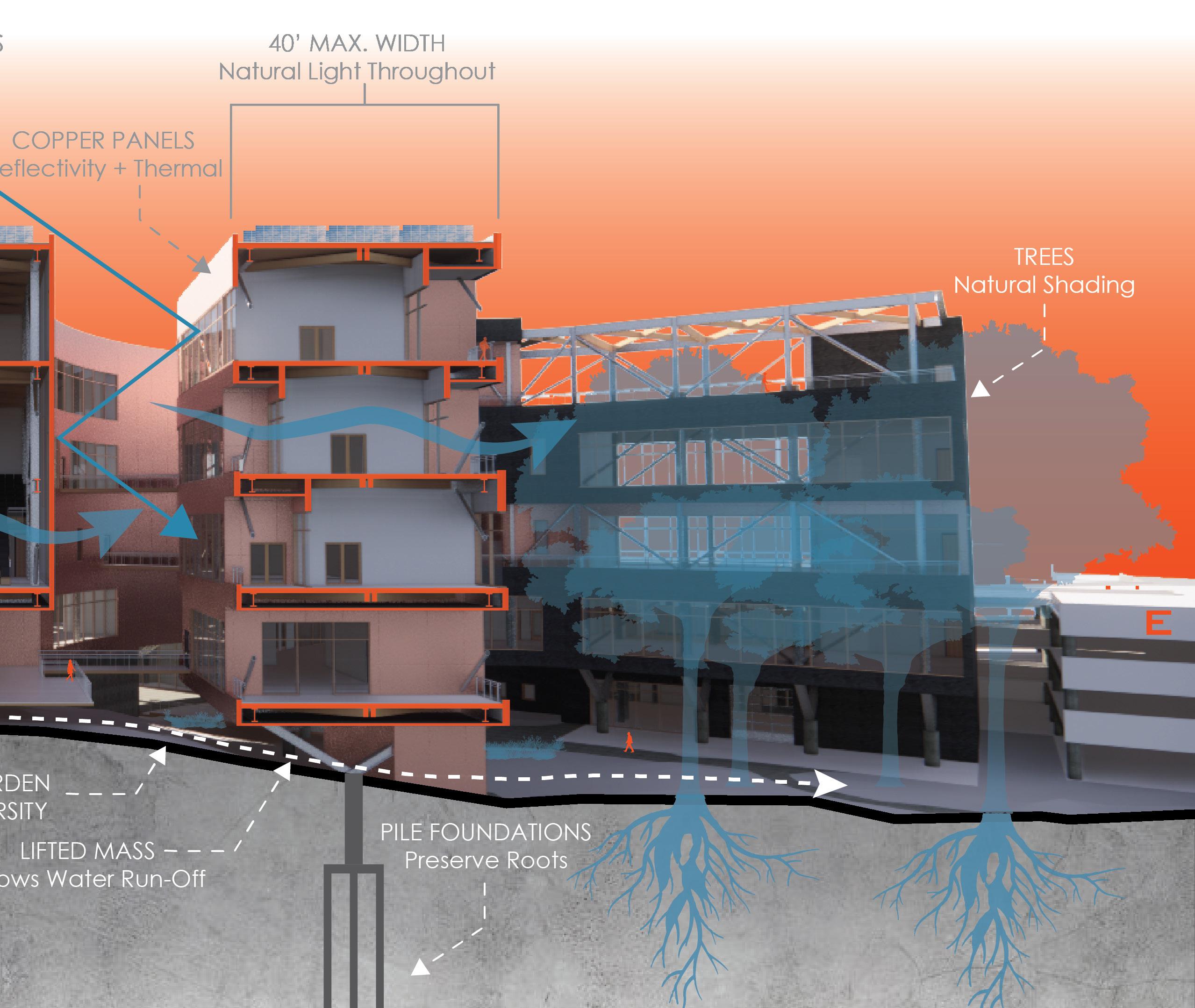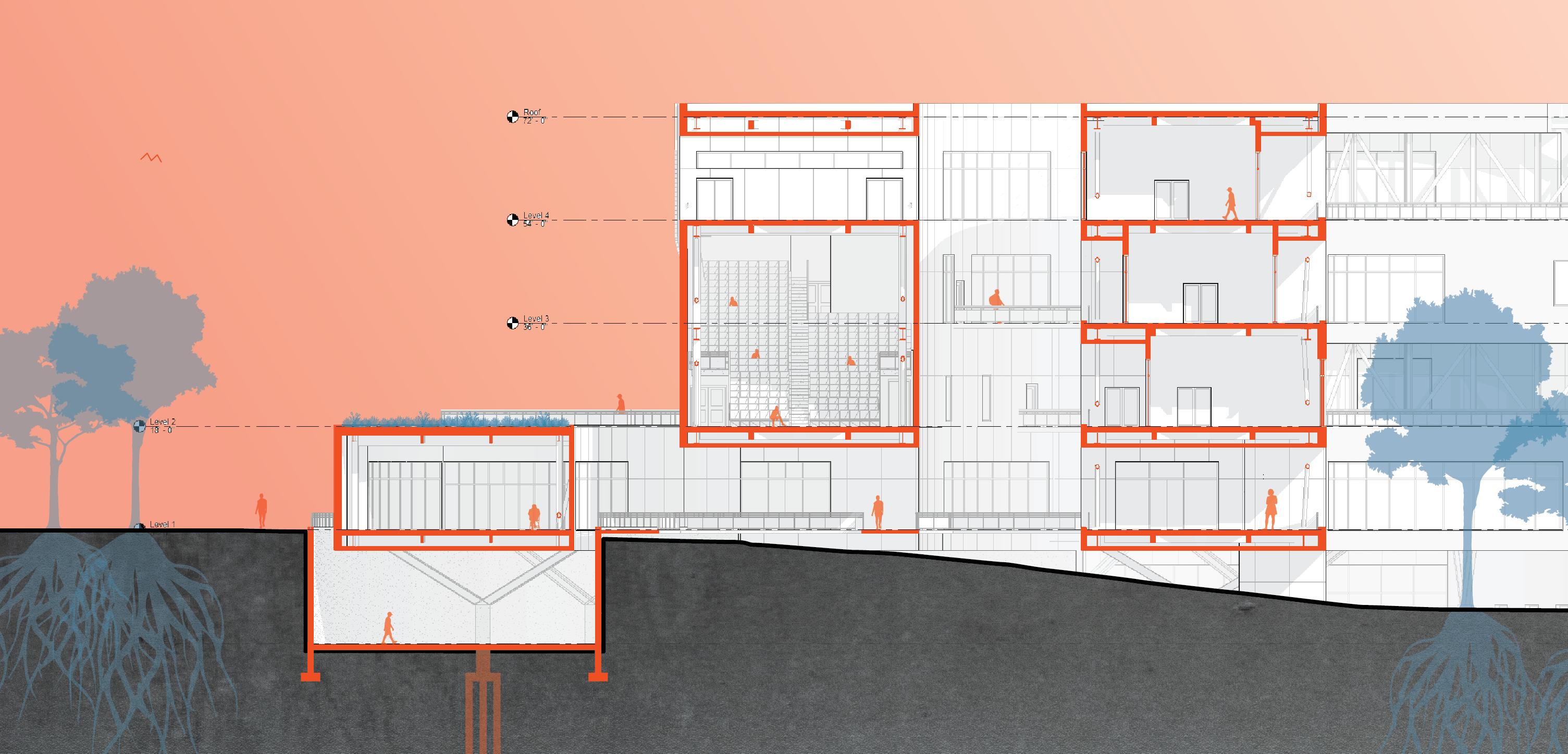 Gradients is a facility that will serve the research needs of the UNC Charlotte School of Arts and Architecture community, and that of the city more broadly. Located on campus this site that has long been given to the person automobile. Maximum conservation of trees and a minimal impact to the natural processes of the site respects the agrarian legacy of the site pre-university and pre-commuter. The building will maintain as its core objective to ensure the minimum carbon footprint. It shall be constructed of reused and recycled materials, which will eventually be disassembled and re-used. Respecting the natural context and the human experience of the site.