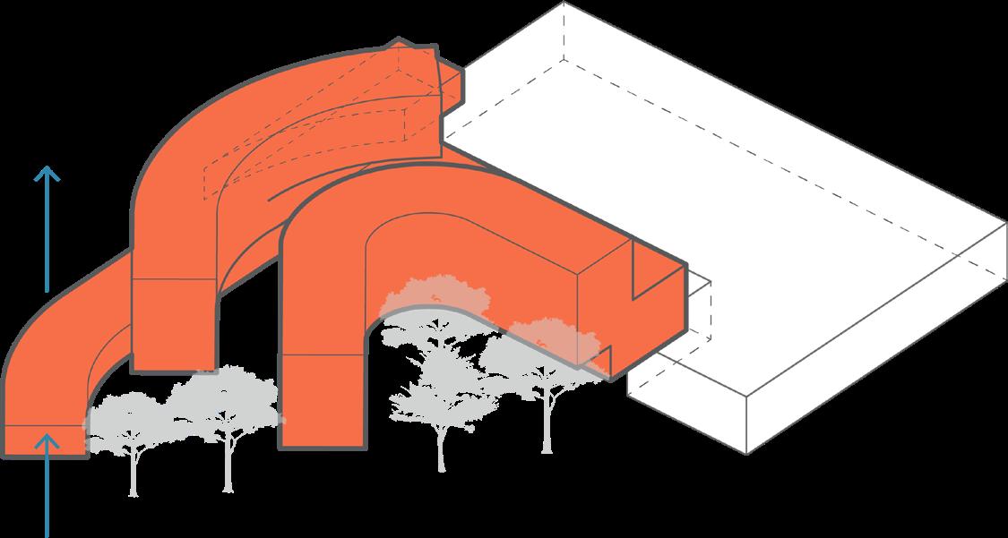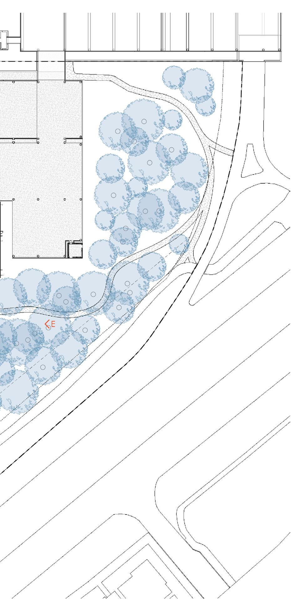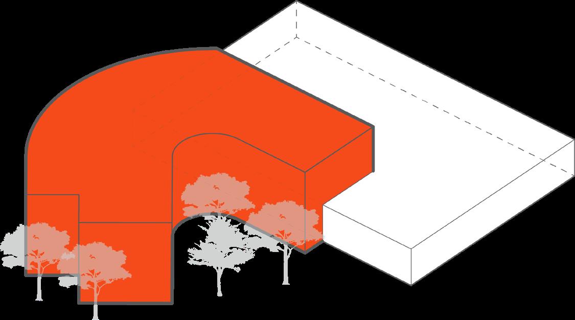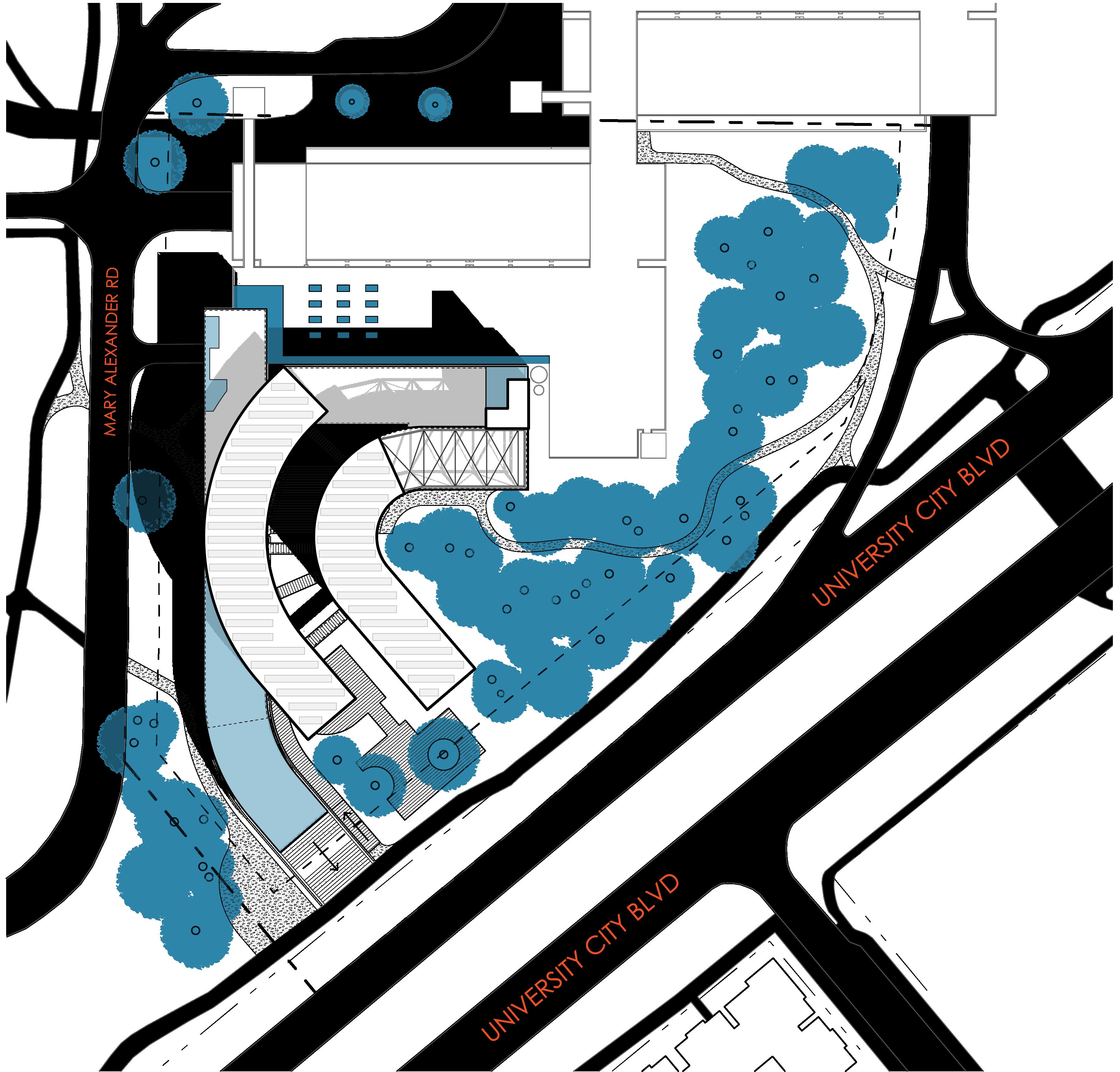 Curve to wrap the wooded area and integrate with the existing parking deck.