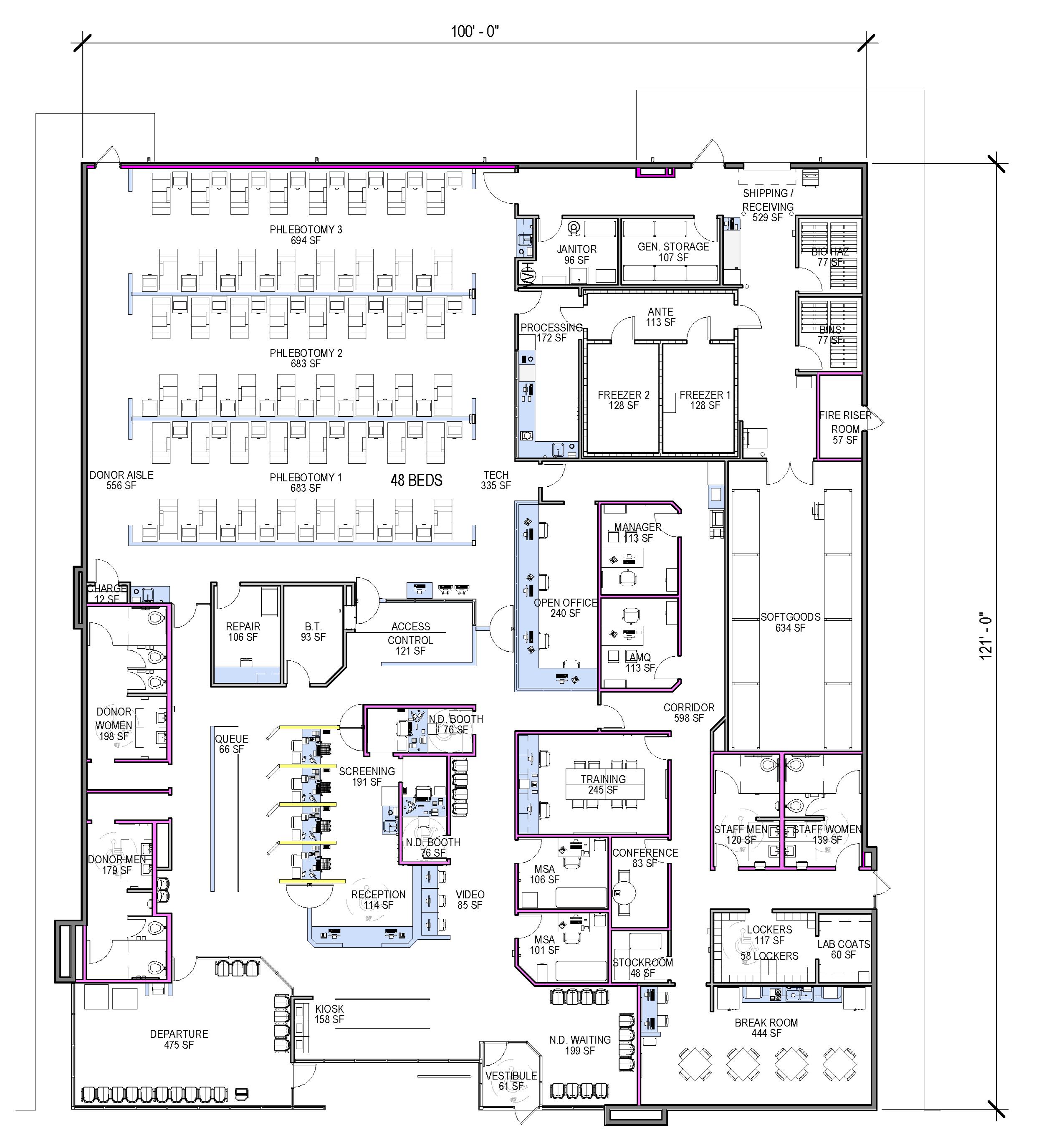 While the majority of CSL projects are interior upfits, I worked to create a standard design for build-to-suit projects. This prototype is the culmination of the work that I did with CSL Plasma. It employs efficient space planning and functional facade design to best meet the needs of the client.