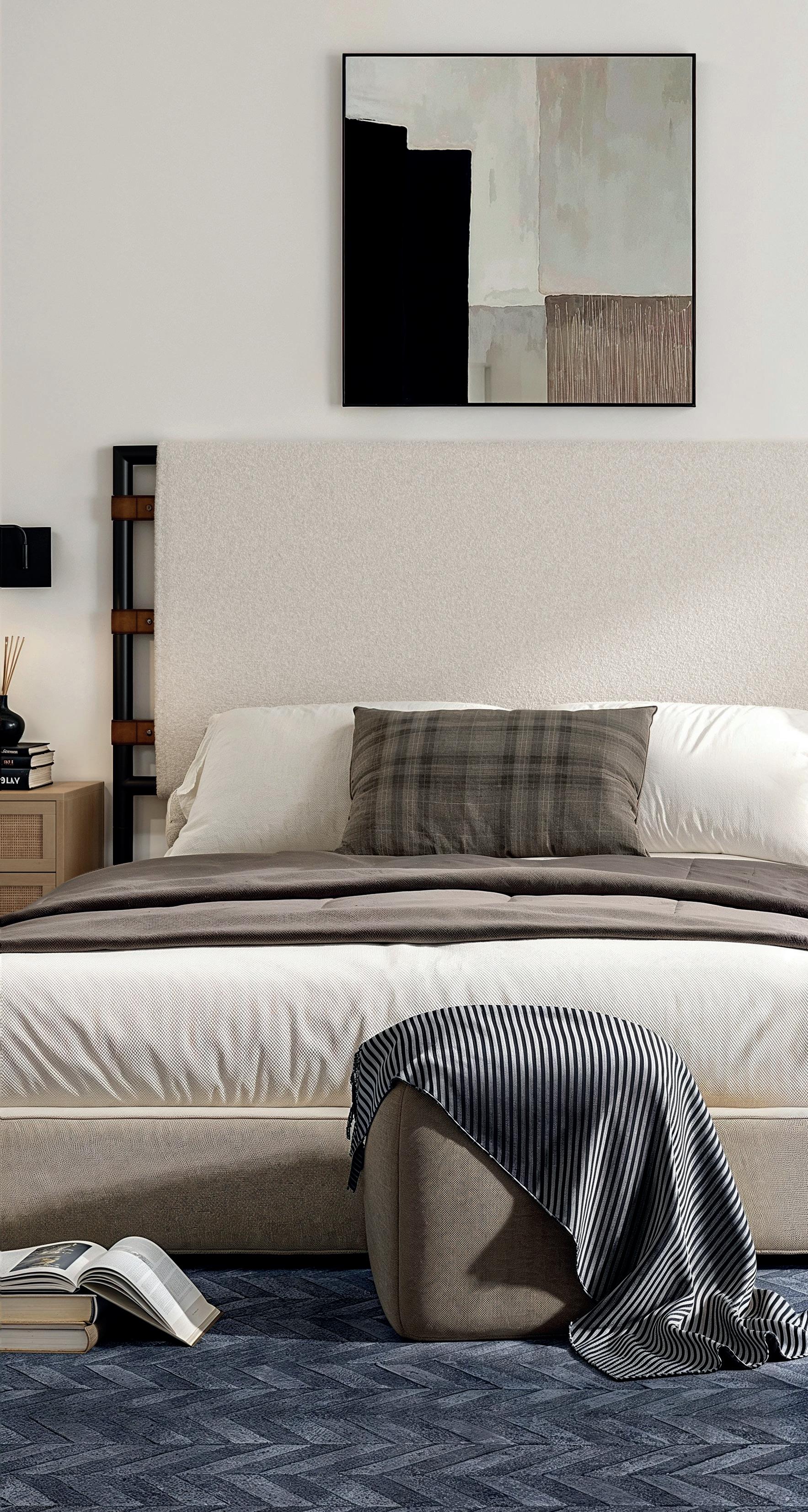 Gracie comes in a variety of upholstery options, including a soft cream boucle, a textured flax linen finish, and a brushed light brown vegan leather