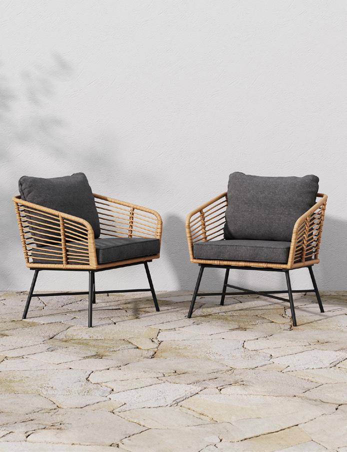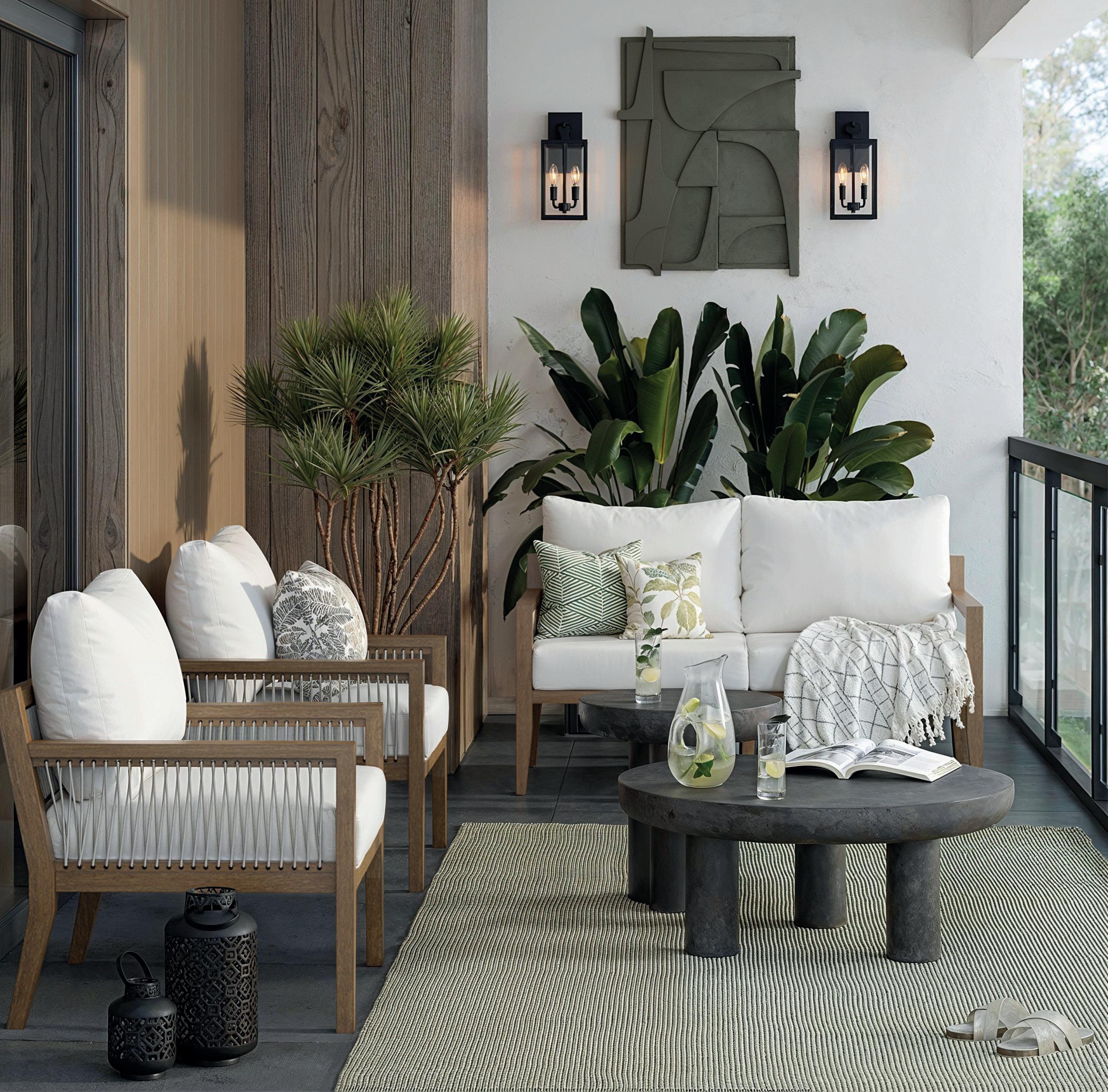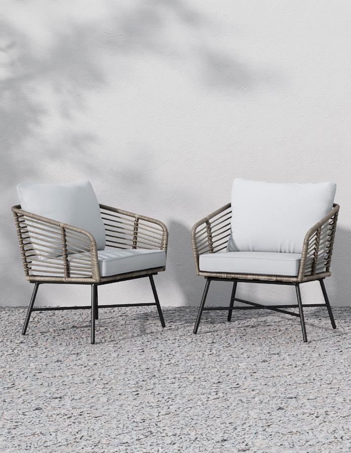 28 OUTDOOR Freya Outdoor Chair 26204 | $349.99 Freya Outdoor Loveseat 26203 | $699.99 Ferris Outdoor Wall Light 14202 | $89.99 Bring on summer Picture yourself lounging on a comfy loveseat, lemonade in hand, or catching up with friends in a chic chair under the summer sky. Our collection promises durability, comfort, and that perfect touch of summer flair.