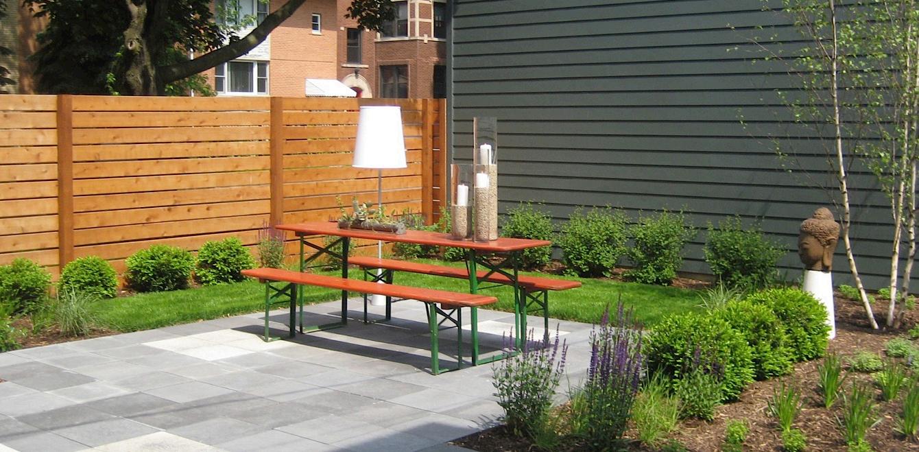 This modern Chicago landscape design embraces contemporary clean lines, creating seamless connections between hardscaping and lush plantings. The sleek paver patio and crisp geometric lawn area provide a strong architectural foundation, while arranged plantings soften the space with natural texture and movement. Defined outdoor living areas, including a welcoming dining space, encourages social gatherings. A warm wood fence adds contrast and privacy, complementing the home's modern architecture. The result is a refined, functional, and stylish retreat that balances order and organic beauty.