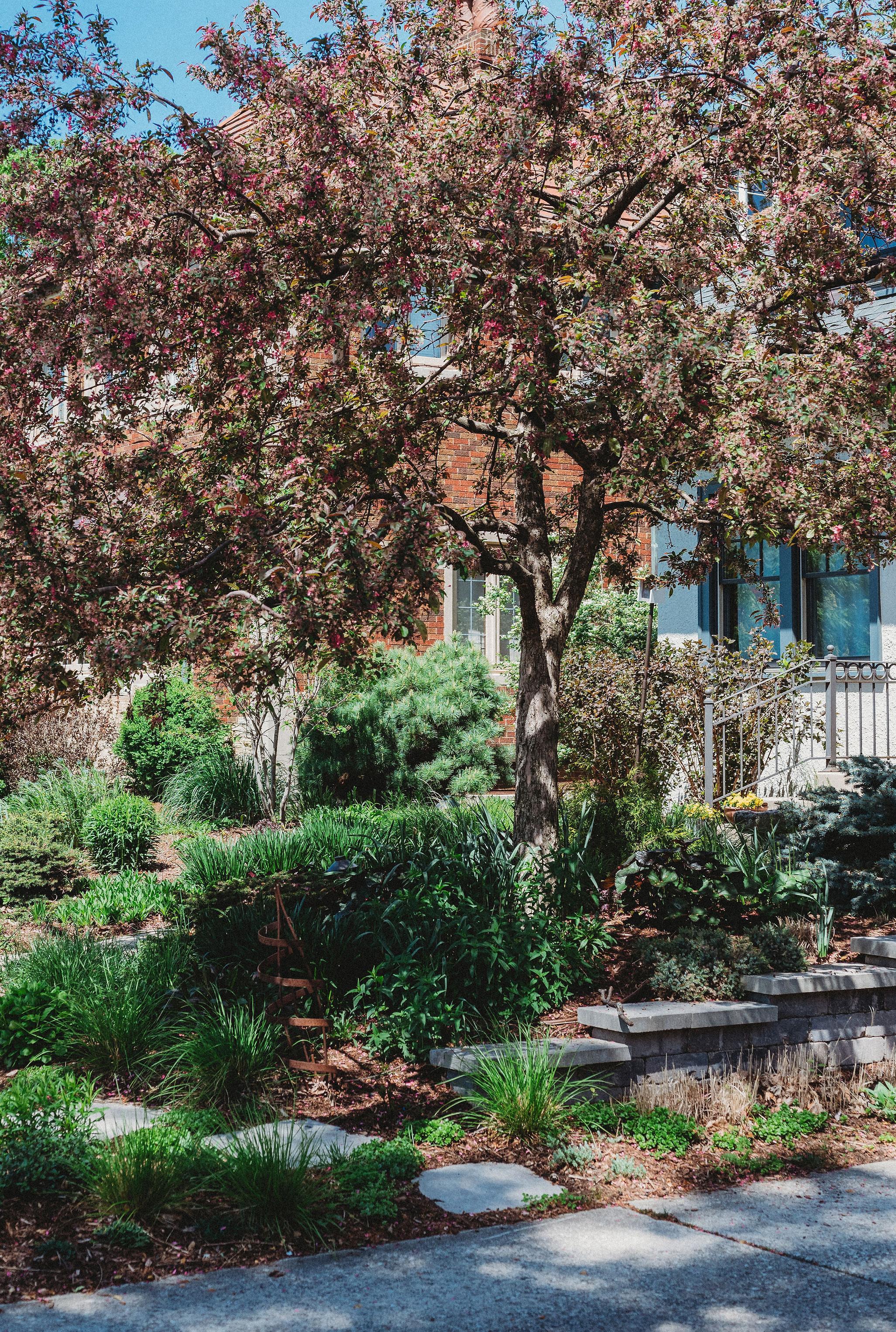 This lush Chicago front yard design features a stunning ornamental redbud tree, adding seasonal interest with its pink vibrant blooms. A rich palette of greens, deep purples, and bright flowers creates a dynamic and inviting space. Layered textures, varied heights, and flowing foliage provide depth and movement, transforming this small urban yard into a natural oasis that adds beauty to Chicago's streetscape.