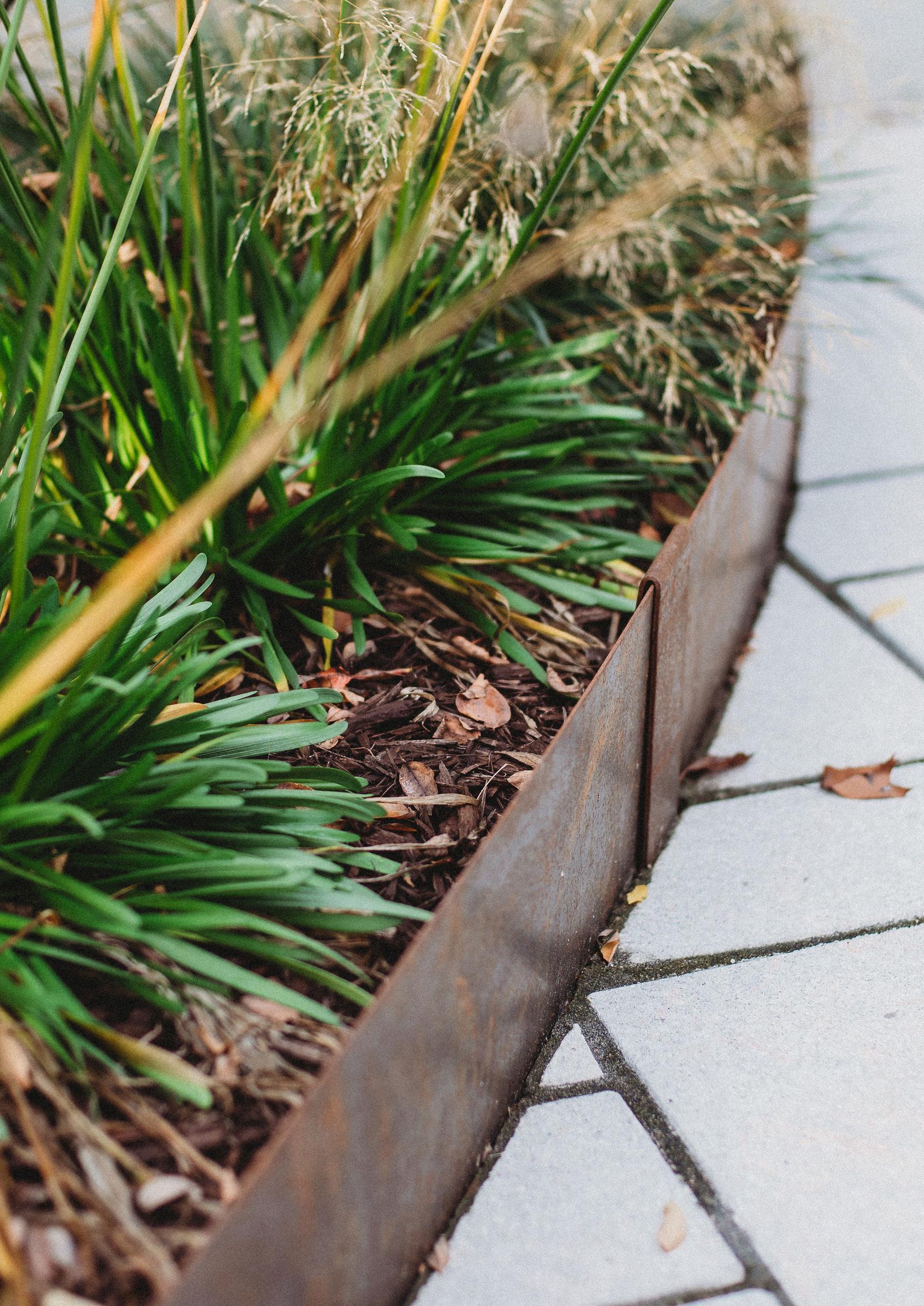 This front yard design features softly curving corten steel edging that defines generous planting beds, creating a fluid framework for a bold, perennial block planting. Masses of climate-adapted perennials offer seasonal rhythm, structure, and pollinator support, with a planting palette designed for lasting visual impact and low maintenance.