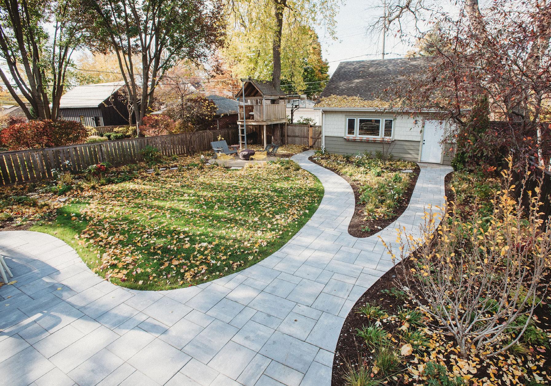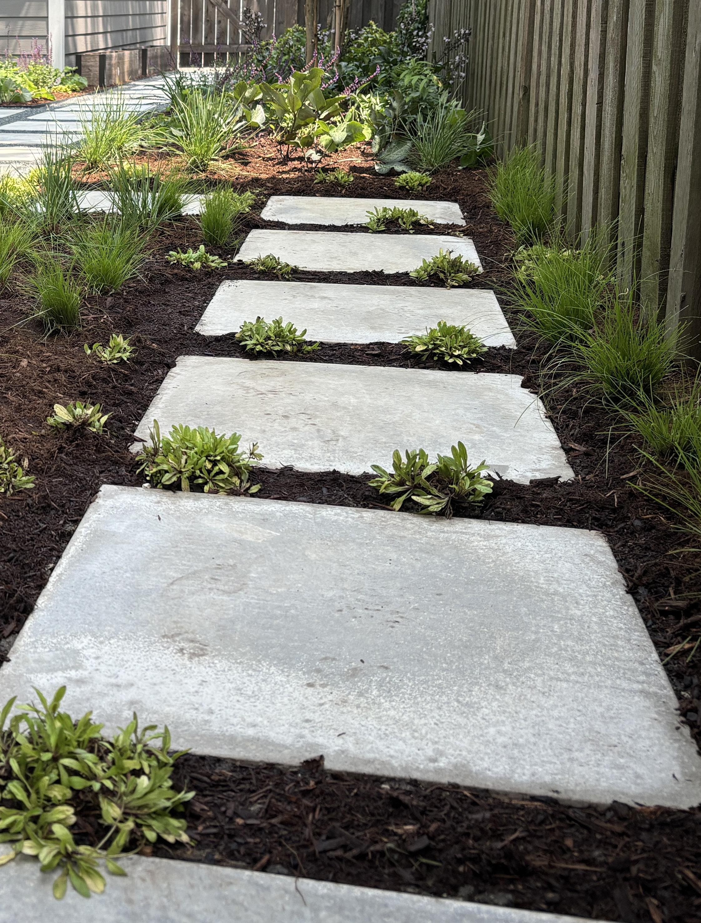 A new paver walkway composed of geometric blocks anchors the space, providing a crisp counterpoint to the softness of the planting. Together, these elements blend contemporary form with ecological function, enhancing curb appeal while prioritizing durability and sustainability.