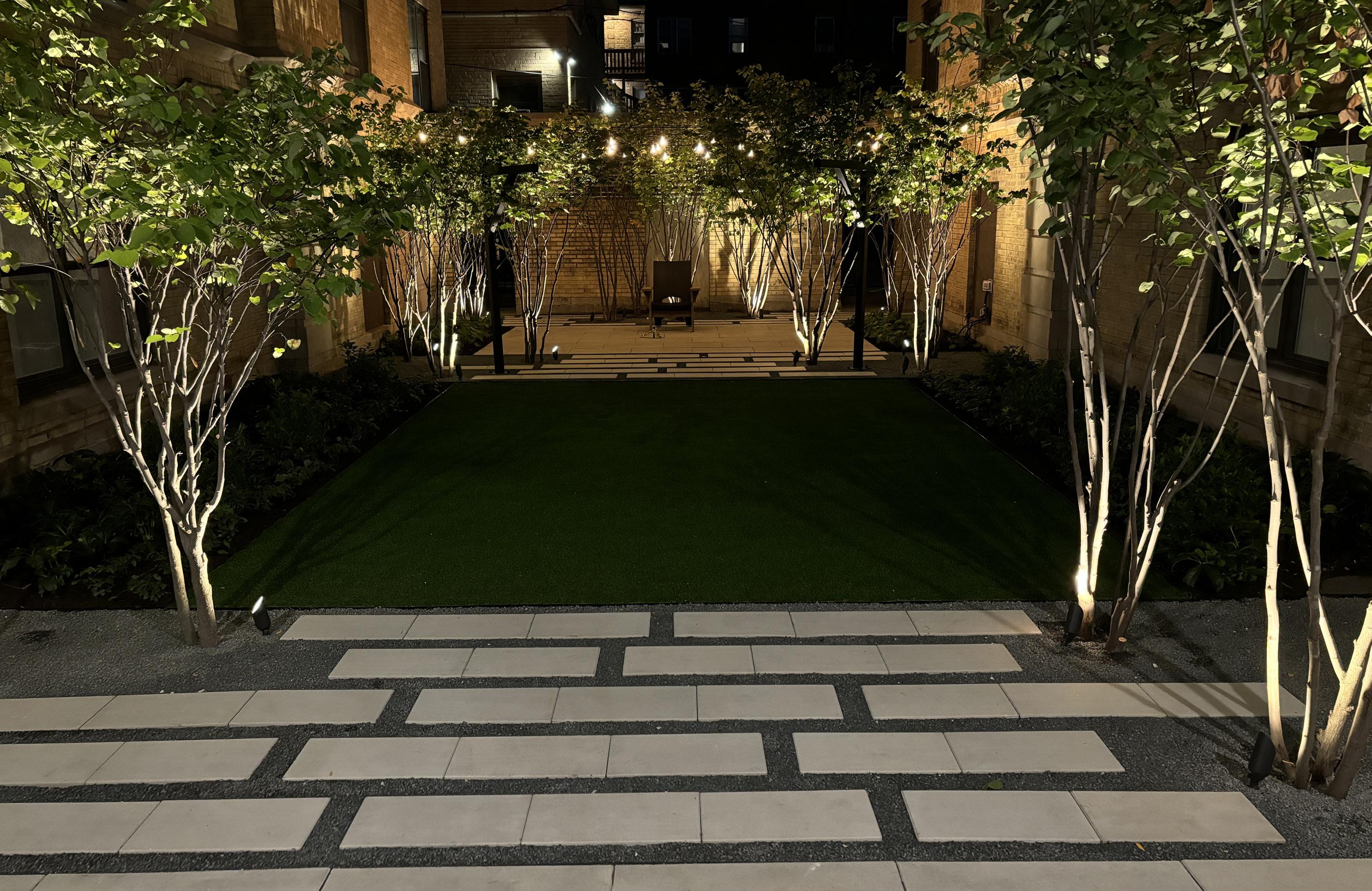 This apartment courtyard design thoughtfully blends function with aesthetics, incorporating smooth patio areas, with an irregularly placed stepper path set into a permeable crushed stone base. The design creates an organic flow, guiding visitors through the space. One patio serves as a grilling and dining area, while another is dedicated to lounging, offering a place for tenents to relax and gather. These distinct areas are separated by lush planting and a lowmaintenance artificial turf grass area, enhancing the visual appeal. Multi-stem trees fill the courtyard with life, adding texture and dimension while providing natural shade and privacy.