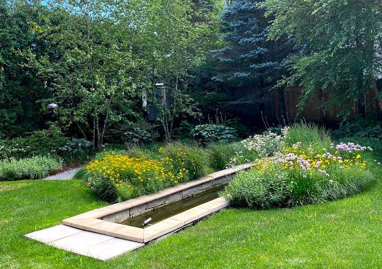 In addition to the front yard’s drainage-focused design, the backyard features a sleek, modern reflecting pool that serves as both a focal point and a tranquil retreat. Framed by lush plantings, the pool adds a striking visual element while reinforcing the theme of water as a unifying feature throughout the property. The reflective surface creates dynamic interactions with light and surrounding greenery, enhancing the sense of depth and serenity.