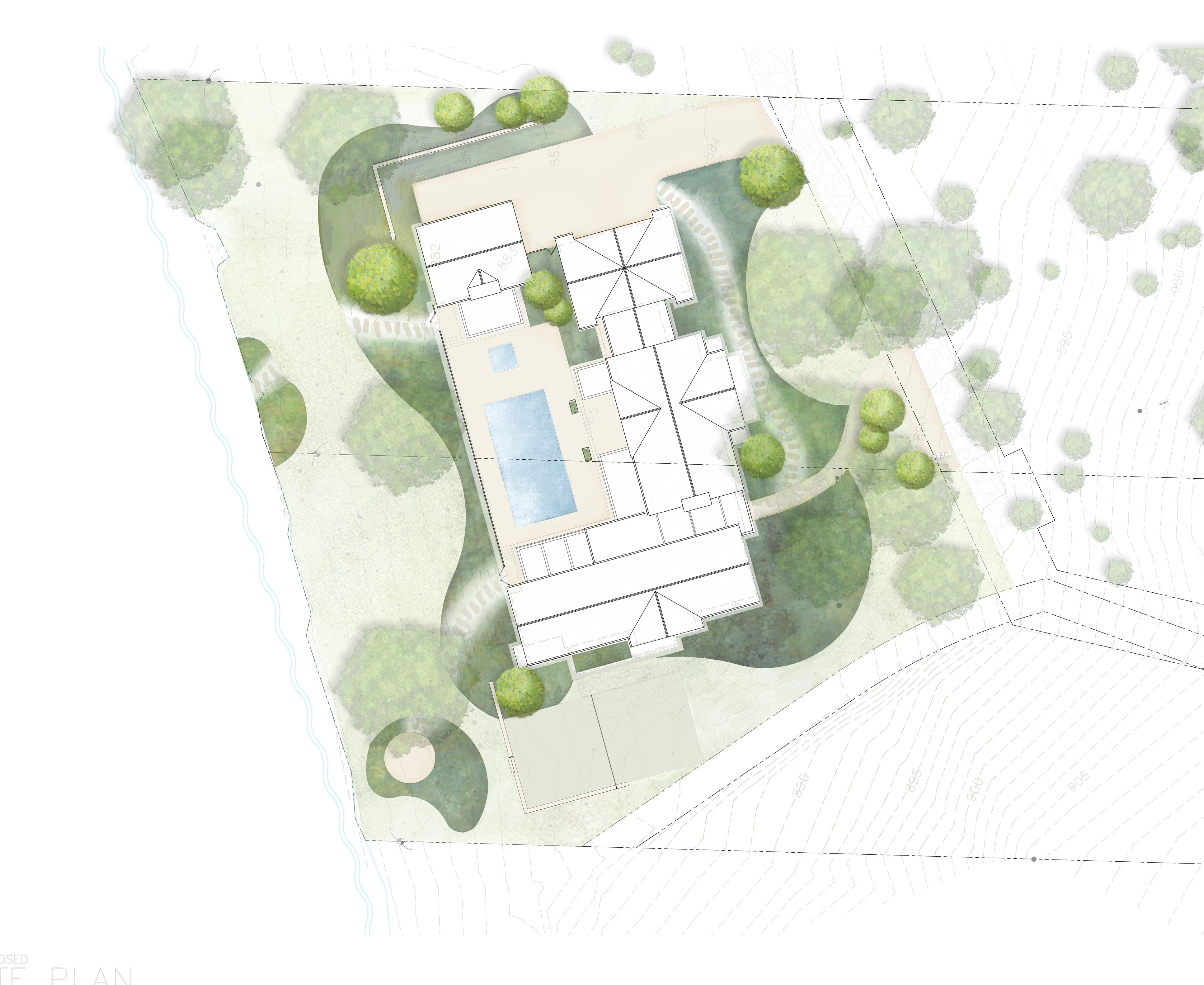 This digital site plan showcases the landscape design for a newly built lake house in Michigan, thoughtfully integrating nature with modern outdoor living. Expansive planting beds soften the architecture, blending the home into its natural lakeside setting. A newly designed pool serves as a focal point, enhancing relaxation and entertainment opportunities. Circulation flows seamlessly through the site, with pathways weaving between planted areas, connecting key outdoor spaces while encouraging movement and exploration. Layered trees & plantings provide structure, privacy, and visual depth, creating a dynamic experience throughout the property. This graphic representation highlights the project's spatial organization, illustrating the balance of form, function, and natural beauty.