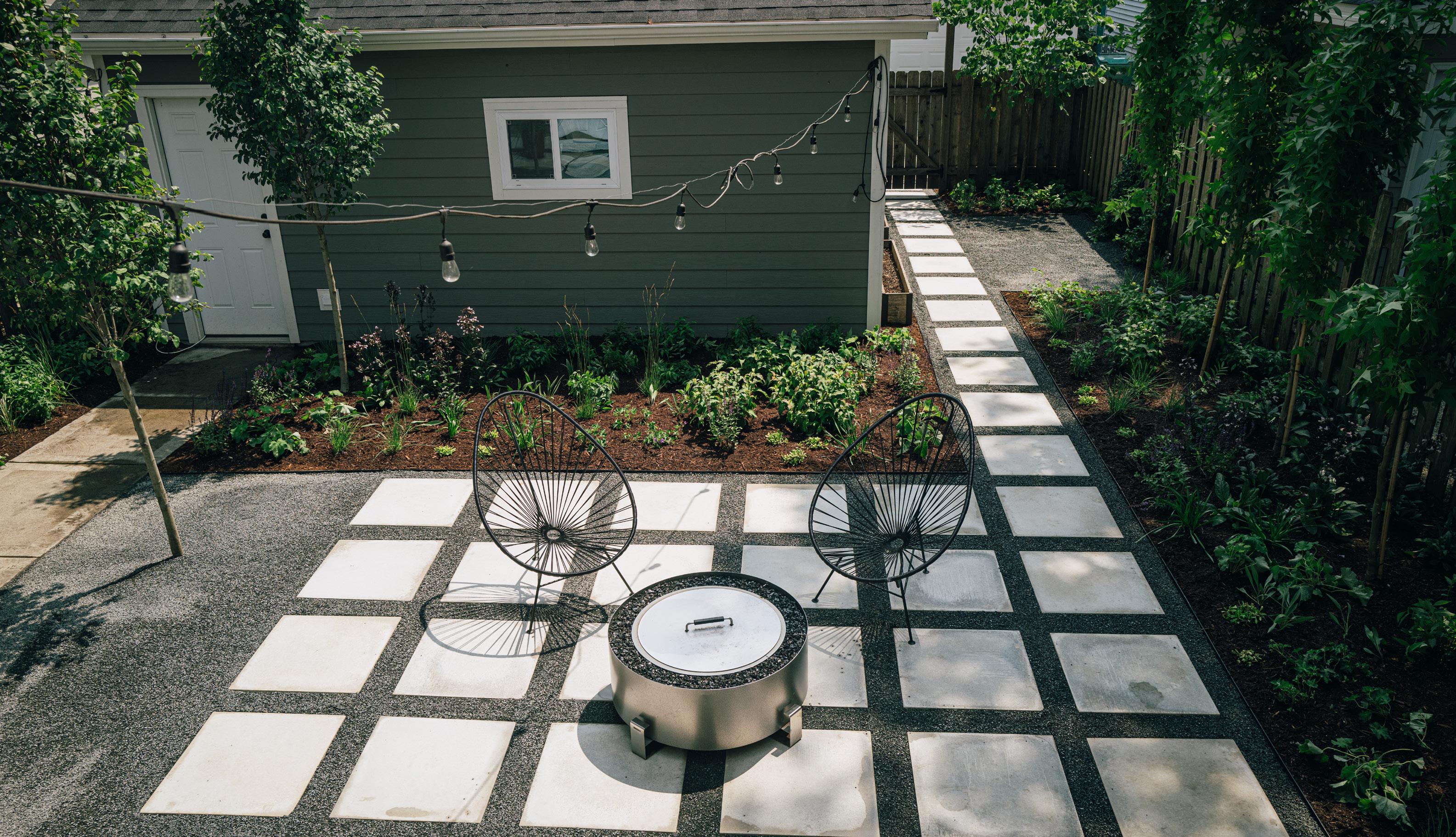 This backyard landscape design features a concrete stepper patio and path set in permeable crushed bluestone, creating a cozy fire pit seating area between the back deck and detached garage. Perennial gardens surround the space, offering year-round interest with thoughtfully selected plants based on height, texture, color, and bloom time. The smooth steppers extend to a side gate, flanked by low-growing groundcovers. A row of trees provides privacy, while string lights overhead add a magical, enclosed ambiance at night.