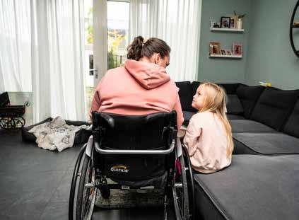 werken. ‘Mijn dagen lijken best saai, maar ik ben altijd wel bezig. Ik sta op, waarna Raphael, mijn partner, me wast en aankleedt. Dan brengt hij me naar beneden en ben ik er voor Michelle totdat ze naar school gaat. Als ze weer thuis is begint de grootste uitdaging van de dag: eten koken. Raphael werkt namelijk in wisseldiensten en is er ’s avonds meestal niet. Als Michelle in bed ligt, kom ik tot rust. Ik kijk wat tv of ga kletsen op het forum voor lotgenoten met MS. En wacht tot ik naar boven word gebracht. Gelukkig heb ik sinds een tijdje thuiszorg, zodat ik niet meer hoef te wachten tot Raphael thuiskomt van zijn werk.’