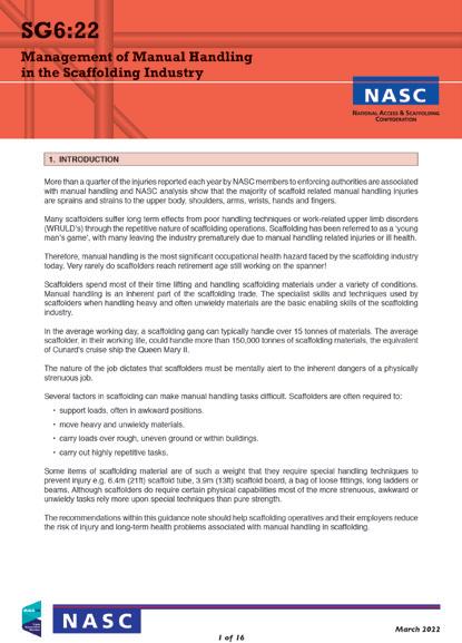 SG6:22 Management of Manual Handling in the Scaffolding Industr y Helps assess the risks posed by lifting, carrying and team manual handling activities.
