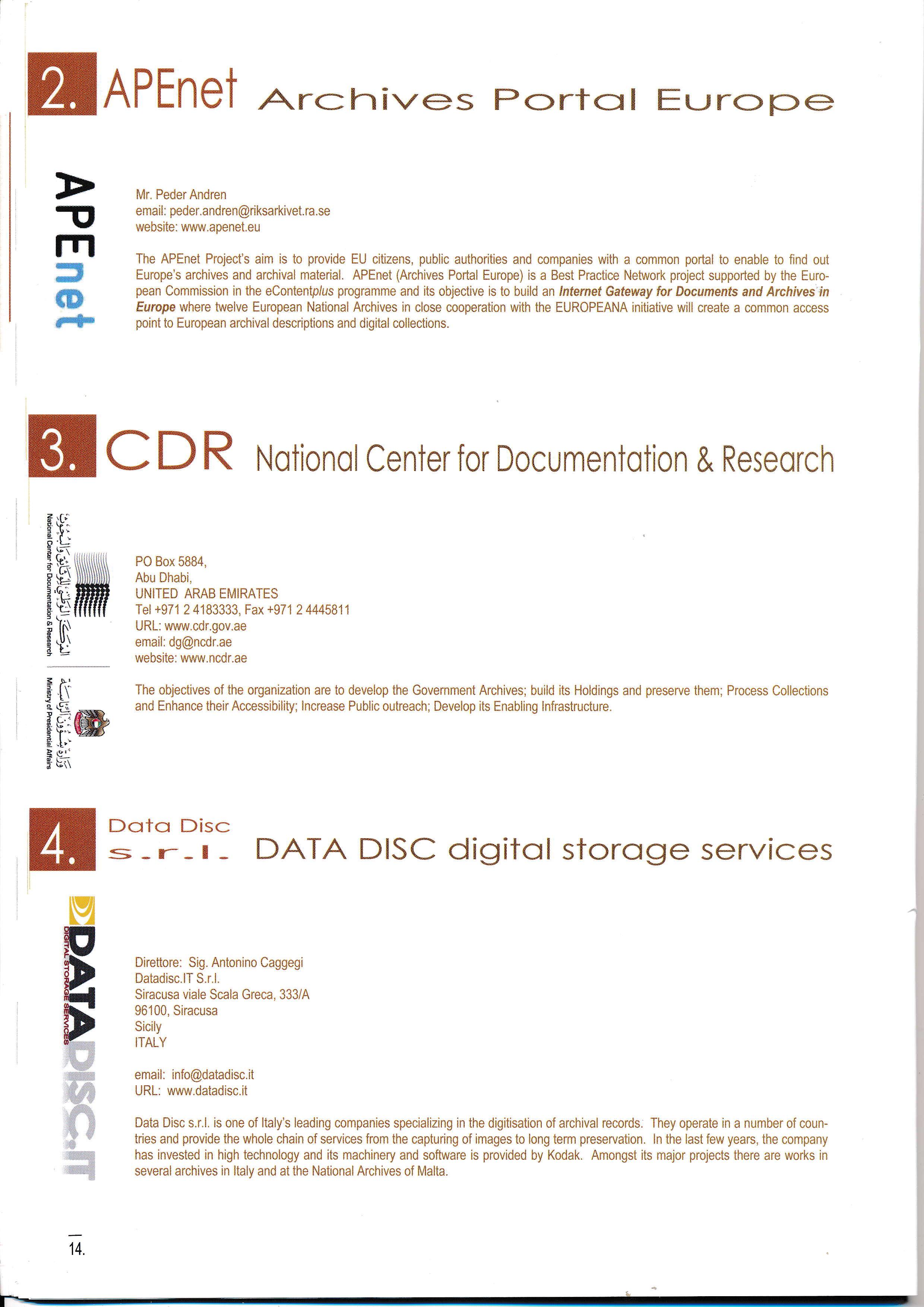 Data Disc s.r.l. is one of italy's leading companies specializing in the digitisation of archival records. They operate in a number of countries and provide the whole chain of services from the capturing of images to long term preservation. ln the lasi few years, the company has invested in high technology and its machinery and software is prcvided by Kodak. Amongst its major projects there are works in several archives in ltaly and at the National Archives of lVlalta.