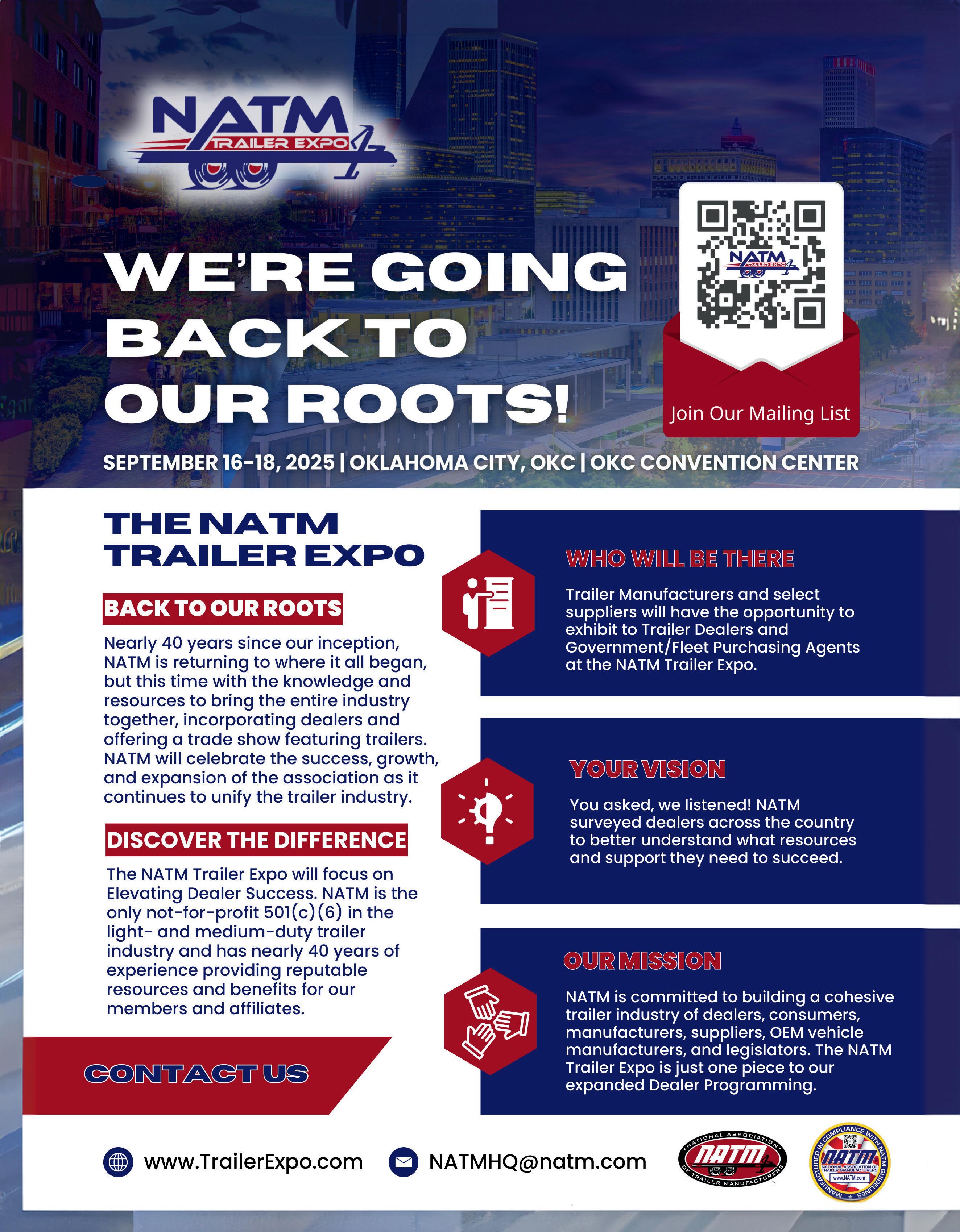 The most exciting development of the NATM Dealer Affiliate programming is the launch of the NATM Trailer Expo. NATM is expanding its educational efforts and support to trailer dealers through the launch of The NATM Trailer Expo: Elevating Dealer Succes. The first NATM Trailer Expo will take place in Oklahoma City, Sept. 16-18, 2025. For more information about this new event, turn to Page 9.