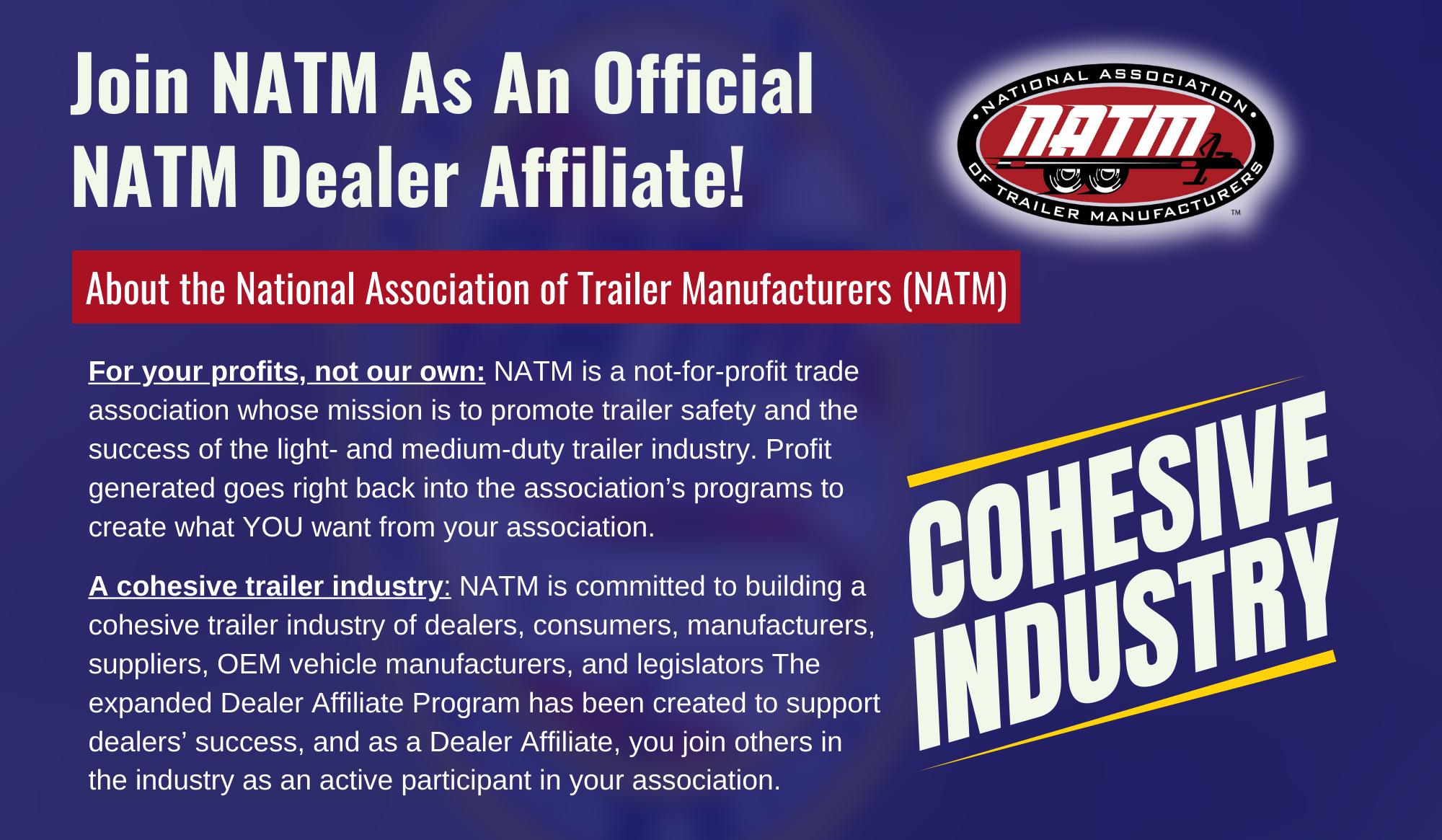 As NATM grows the Dealer Affiliate Program, our goal is not just to provide solutions, but to shape the future of the trailer industry collaboratively. The Association is dedicated to crafting benefits that resonate with your needs and desires as dealers. Your insights fuel our innovation, and your participation isn't just invited – it's essential. Come be a part of this new chapter of growth and have your voice heard.