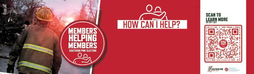 Being a Southern Pine Electric Cooperative member is di erent from simply being a customer. Our members are invited and encouraged to be active in the cooperative, and the co-op has a responsibility of involvement in the communities we serve. It is one of the guiding principles that we abide by in our day-to-day work. That is why we are launching a new voluntary program, Members Helping Members, where members can help support each other, and their own communities.