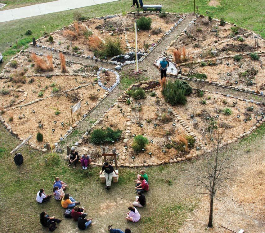 At the edge of one planting, a variegated yucca makes a bold statement.
