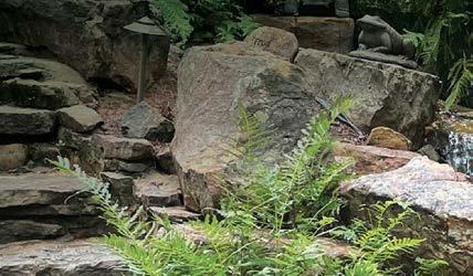 The stones are carefully arranged to look as though they’ve always been there, blending seamlessly with the surrounding plantings. In a few places, the water splashes over mossy crevices, adding a touch of natural wildness.