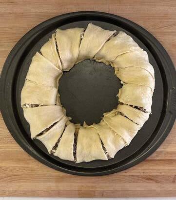 On a greased, or parchment paper lined, pizza pan, unroll crescent rolls, separating each one. Arrange the crescent roll triangles with the thick end of the dough toward the inside, in a sunburst pattern. The base of the triangles should overlap so the wreath seals well.