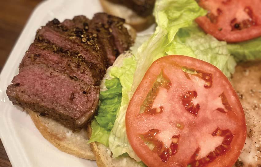 I like to layer mayo, lettuce, tomato, the steak, and homemade blue cheese dressing. 1 steak will make 2 small and 1 large sandwich. Your choice.