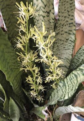 When a Sansevieria flowers, it sends up a tall stalk from the base of the plant, topped with small, star-shaped blooms usually creamy green to white in color. These flowers are often pleasantly fragrant, especially in the evening, and they may produce sticky droplets of nectar along the flower stalk.