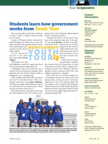 dinated at the state level by the Alabama Rural Electric Association (AREA). “It’s great for them to see the lessons they learn in the classroom come alive at the capitol,” says Cary Hatcher, manager of member relations for WEC. “They’re not too far from being off in the world as adults, and the better they understand government and rural electric service the better citizens they will be.” Aside from the lesson in government, students also learned about the importance of rural cooperatives and their efforts. Speakers particularly focused on the difference between member-owned cooperatives like WEC and publicly traded power companies. WEC will select two of these students for its Washington Youth Tour. In June, WEC will sponsor them as they join over 1,600 other students for a tour of the nation’s capital. The trip includes visits to Capitol Hill, Arlington National Cemetery and the Lincoln Memorial. Students will also attend Rural Electric Youth Day to learn from public figures and other inspirational speakers. A