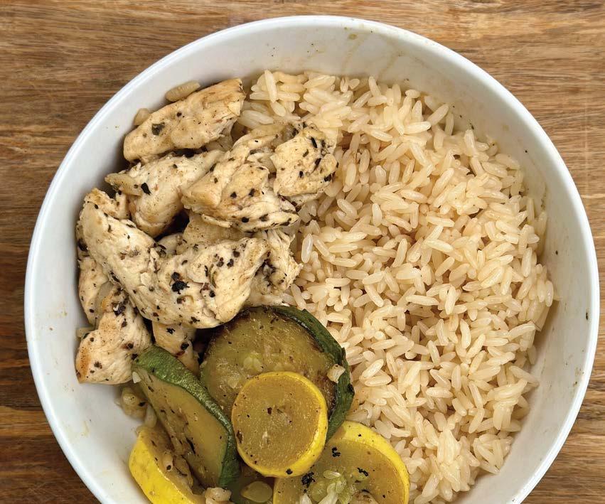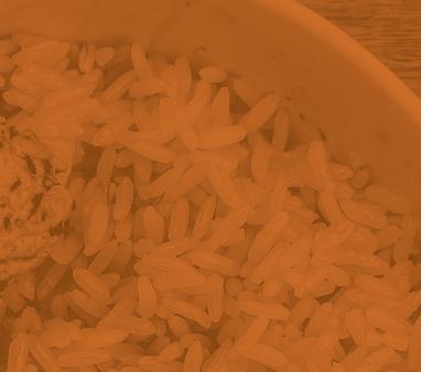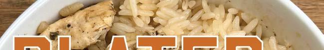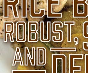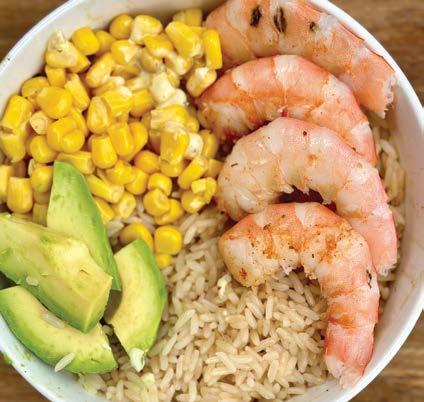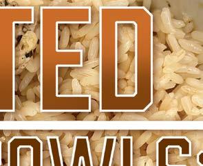 To make a rice bowl, start with a base of simple white rice, or choose brown or wild rice for more fiber and rich flavors. Rice, especially brown rice, is a healthy grain with a high source of fiber and folate. Try basmati, jasmine, or even yellow rice. There is no shame in using 90-second or quick-cooking rice. However, cooking rice from scratch is cost-e ective for feeding a crowd. Pro tip: once rice starts to simmer, wait to stir it until it’s done!