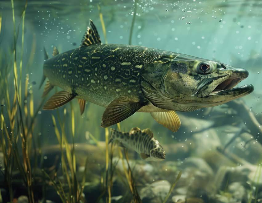 camouflaged coloration to ambush prey. Pickerel hide in thick vegetation waiting for unsuspecting creatures to venture too close. When they see something tempting, the water wolves slash out with amazing quickness to seize prey with their sharp dental equipment.