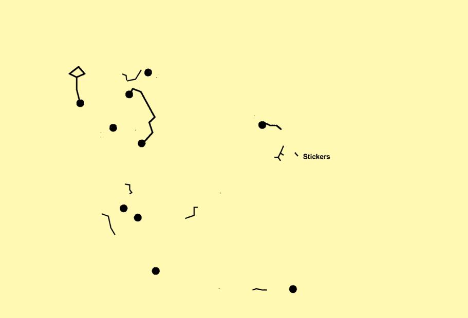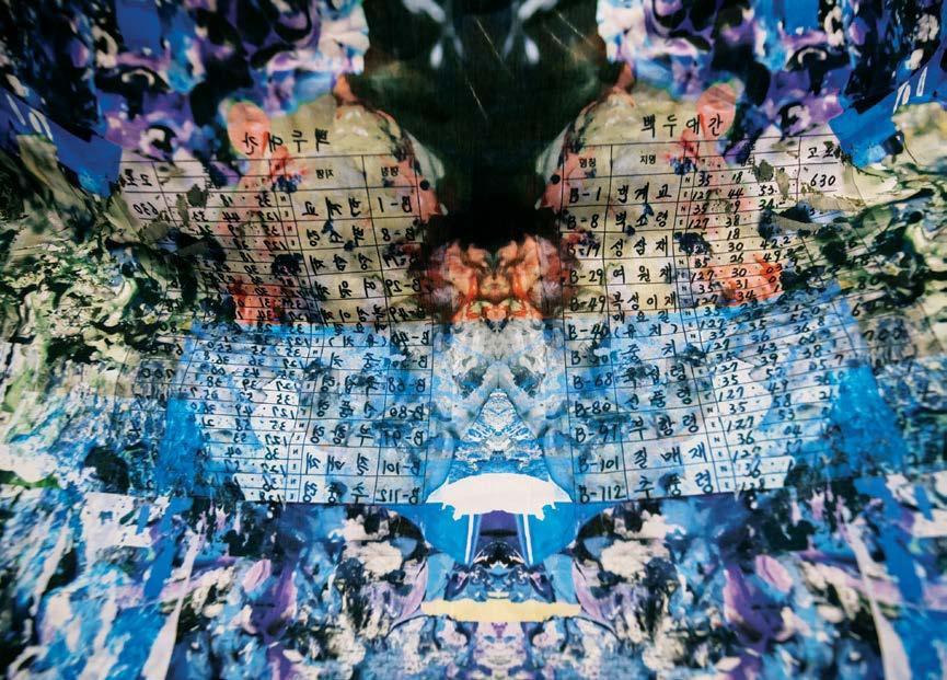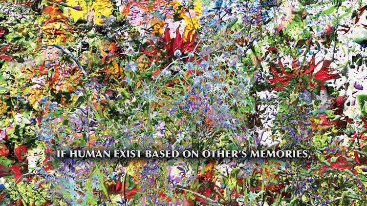 Aa teardrop on what he saw as an eye in an image; it could be a meme of Karl Marx or Frantz Fanon, a Manga character or Paul Klee’s exterminating angel, or the headlights of a vehicle or the corner of a QR code, a robot or a frog on top of a flag inside a digital canvas created by Reddit users one pixel at a time before being erased by other users, a cat photoshopped to fire a gun or giving advice for staying hydrated, the figure in Afifa Aleiby’s work at TPD Level 1, or the golden royal dragon printed on a sack of rice from the local Fairprice supermarket and so on. Through one meme after another, Shehadeh, we gathered, was attempting to articulate something within him, acting like a persona that existed as an emoji (or perhaps a feeling) and inside memes. We invited Shehadeh to propose visual links to Natasha using this logic. Public relations teams commonly call such images “key visuals,” but they were visual links for us. Shehadeh presented several sets of memes that interpreted Natasha: as the eyes and nose of a cute teddy bear of the type we would see in East Asia, as a female manga character, or as handwriting, using strokes of several colours. Among the biennale team, our imagination awaited a physical presence of what was inherently a spirit. Shehadeh further worked with the design team and incorporated one of the in-progress drawings he had produced for the biennale. It was of a face or an entity that melted, dissolved or crumbled as it attempted to protect its presence, endangered by people’s (or algorithms’) ability to clearly interpret what that entity was. It was fighting the danger of having its identity revealed. Shehadeh resolved this by complicating the image-making process and adding water elements to obscure the image. When it was in water, the image rippled and reprocessed again; a person, flag or landscape could look like a pool of colours. Its meaning and identity were there, just receding to the background. We also invited other artists participating in the biennale, including Berny Tan, Brightworkroom and Moad Musbahi, to propose visuals. Their contributions were drawings or impressions that were then juxtaposed against a background of a repeating straightforward set of information about Natasha, that it was a biennale, its name, and the opening and closing dates. Culled from a series titled Thought Lines that responds to mechanisms of anxious thought, Tan’s contribution featured her embroidery: One thread was wound around the border of a hoop and then all the strands were gathered from the other side of the ring and tied together in a ponytail. “Being a key visual for the biennale, they allowed this embroidery to take on new meaning. For example, you could read it as multiple touch points coming together within a larger structure which is essentially what the biennale is,”6 but also, “you’re looking at the back of someone whom you cannot see or to whom you just said goodbye.”7 Do you see the invisible threads coming in and out of Natasha’s mind map?8