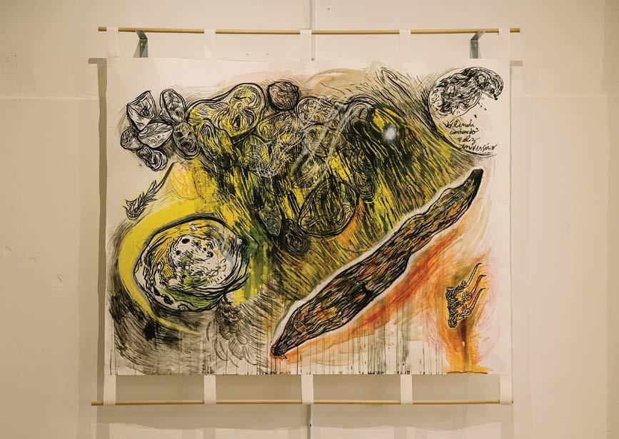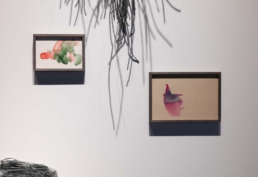 On a wall painted in the colour of green mould hung a constellation of 20 paintings, each an intricate dance of black lines entwined with splashes of blue, white and pink hues. The work was Die Flut by Ali Yass, and the selection of paper, ink and forms were all autobiographical. Yass used Misumi Kozo’s delicate paper, which is an unforgiving paper. Kozo paper does not allow one to remove or fix a line that has been drawn on it, thus forcing the artist to deal with the brushstrokes as a given. Through this intentional vulnerability, Yass forges a connection between his art and the essence of existence. He embraces imperfections, shunning the impulse to erase or refine. Instead, he transforms every blot or smudge on the paper into a foundation for something new. Just as in life, hurdles are not to be discarded from memory but moulded into a narrative of moving on.