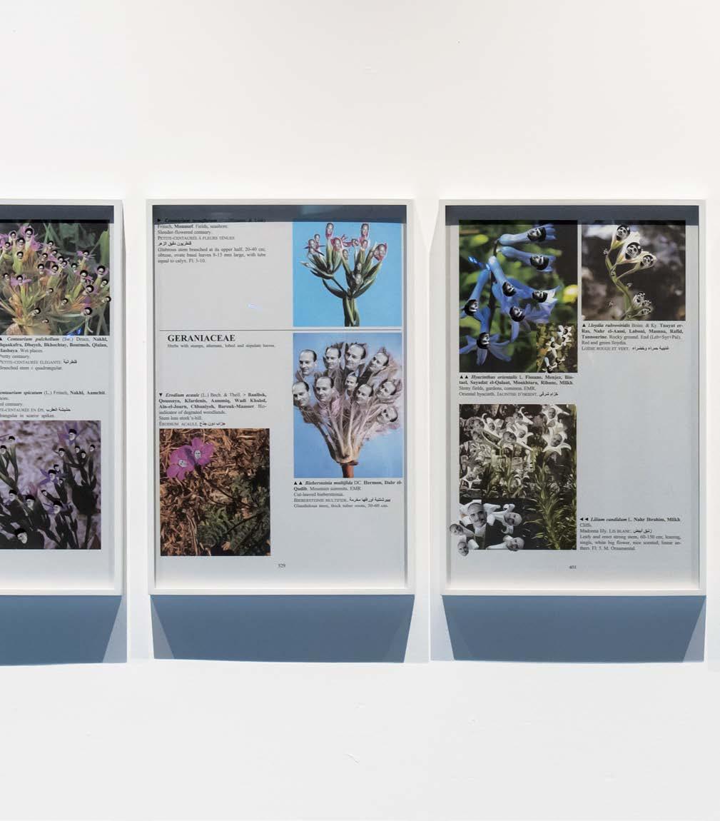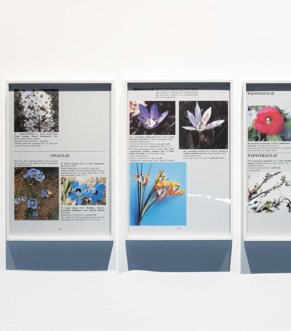 The projection of the waterfall poured over the peoples’ bodies as they stood before it. Visitors often streamed these images and selfies with other results on social media, demonstrating how artworks sometimes stimulated fun experiences. Others kneeled or bent their bodies to photograph the miniature figures of Margaret Thatcher, Ronald Reagan and Mikhail Gorbachev at the bottom of the waterfall. Thatcher also appeared on the opposite wall, in one of several selected prints from Raad’s Better be watching the clouds. In these plates of illustrated pages from a scientific book on botany, plants bloom with the heads of political leaders; the pages are guides to the names of flora that were assigned as pseudonyms for political figures by a female Lebanese intelligence agent, Fadwa Hassoun, during the civil war. The political leaders can be identified or were grouped because of particular associations with the political faction or Lebanese militia mentioned in the prints’ captions. Both works by Raad’s The Atlas Group play on fictitious stories that could have existed in the history of the Lebanese civil war. In the case of Comrade leader, the act of naming honours patronage, while in Better be watching the clouds, removing or replacing a name with a code name becomes a political tool that obscures the namer’s relationship to the person. Many of the figures in Better be watching